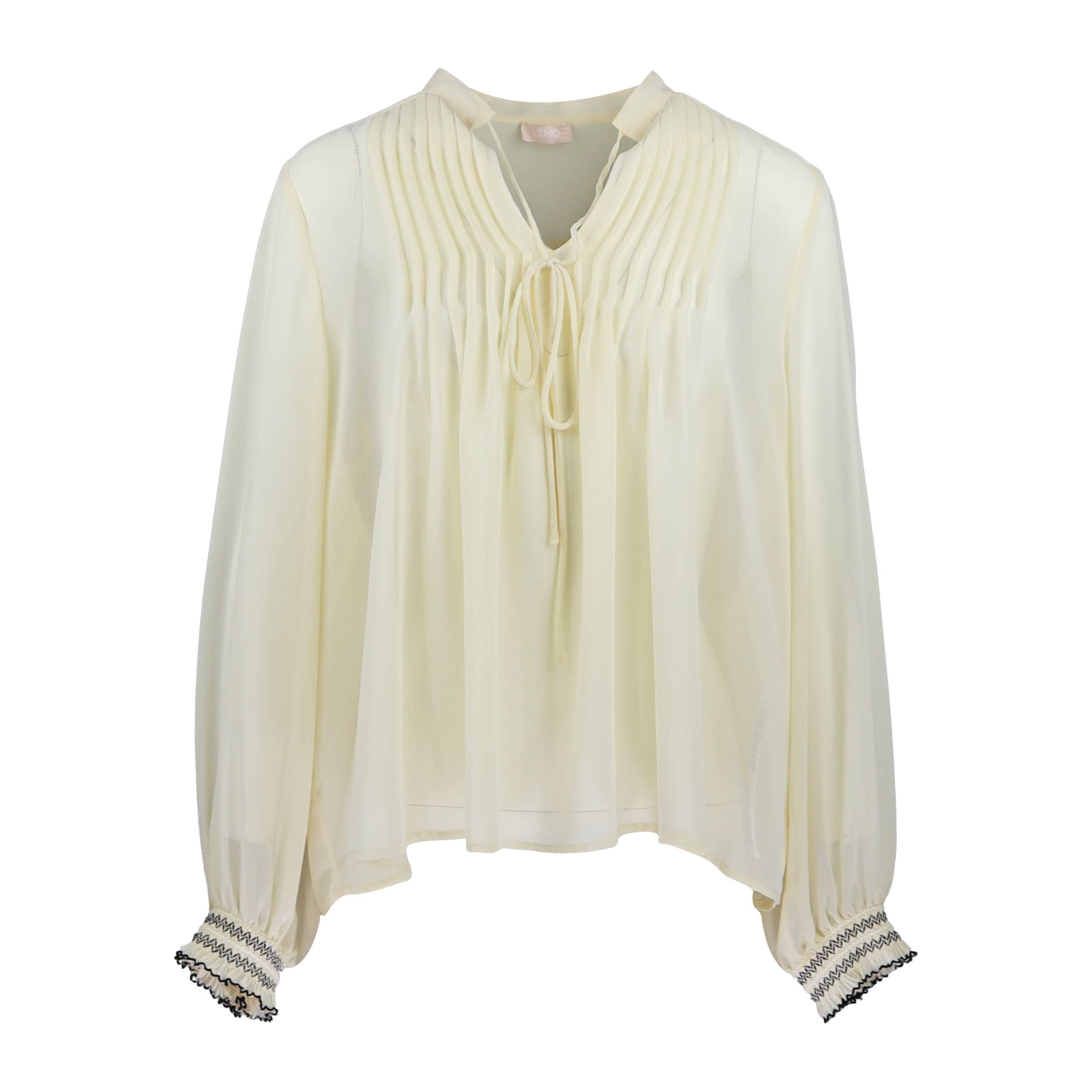 Ecru blouse van Liu Jo, model tunica ts nav in naturale. Deze blouse is gemaakt van een doorschijnende ecru stof en heeft een losvallende pasvorm. De blouse heeft aan de voorzijde een geplooide V-hals met koordjes die je kunt strikken en zigzag stiksel aan de manchetten.