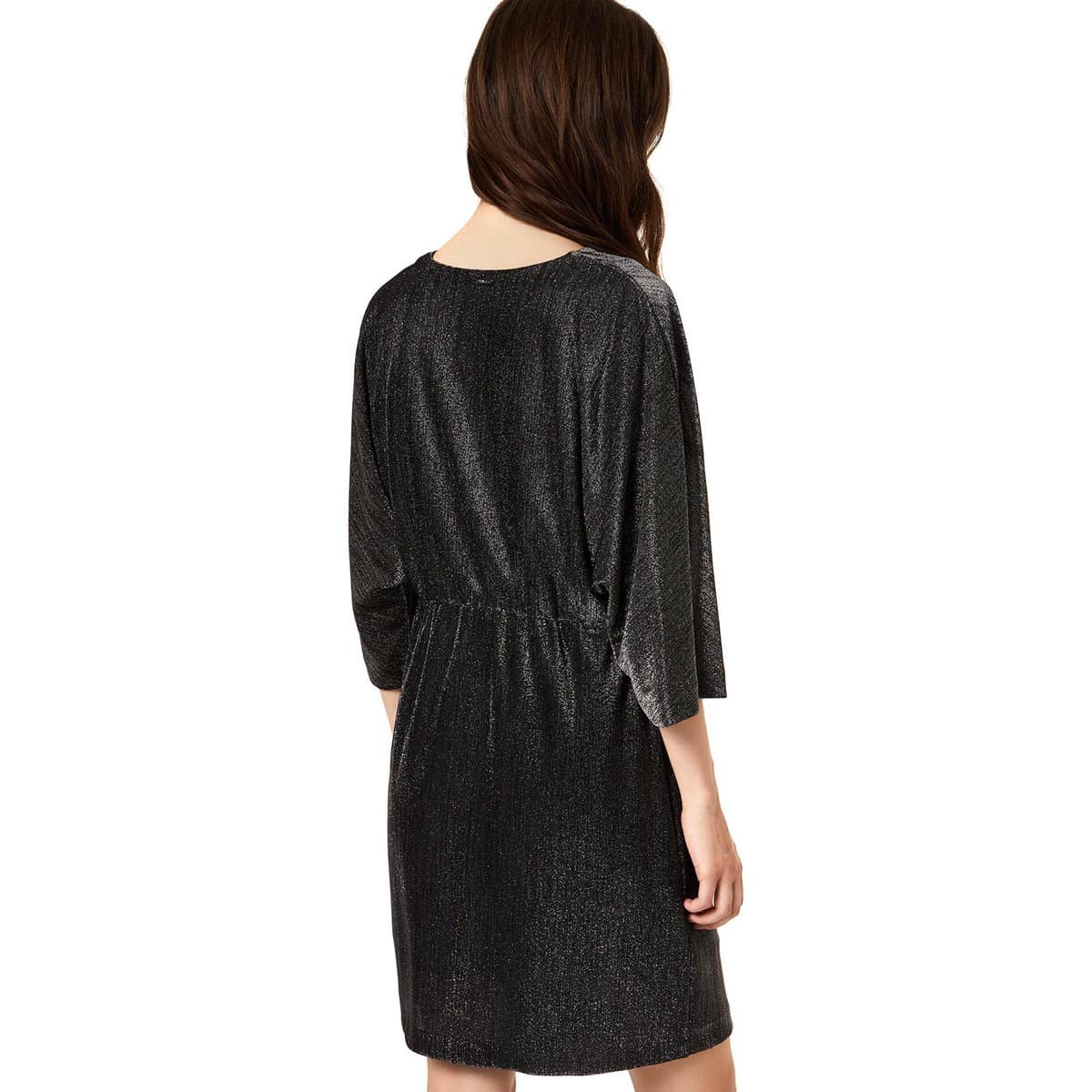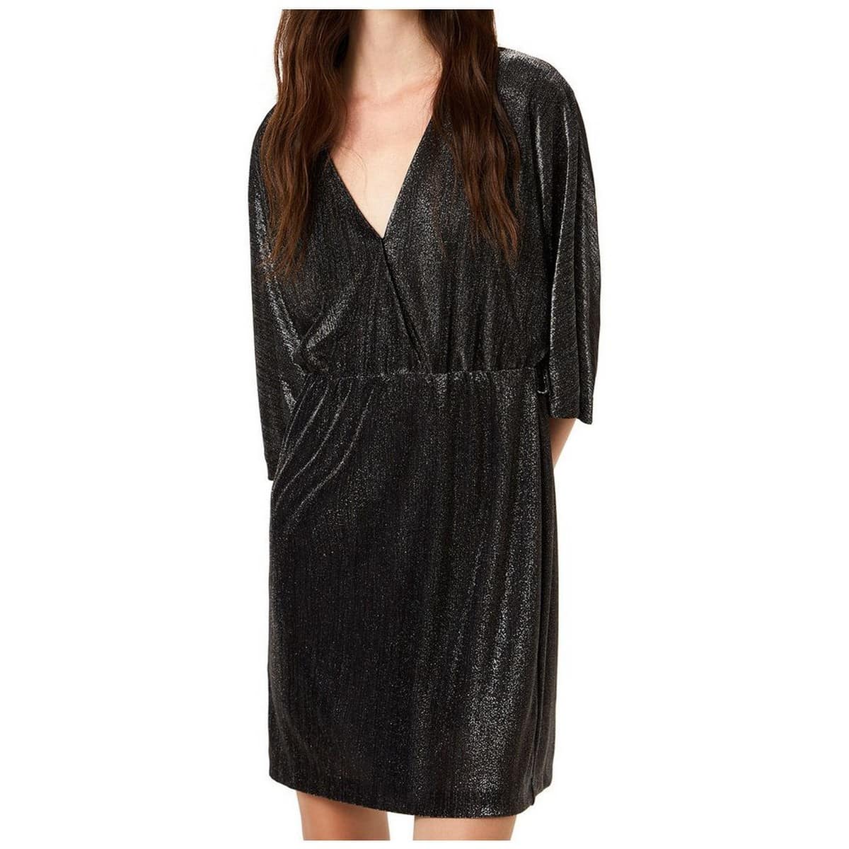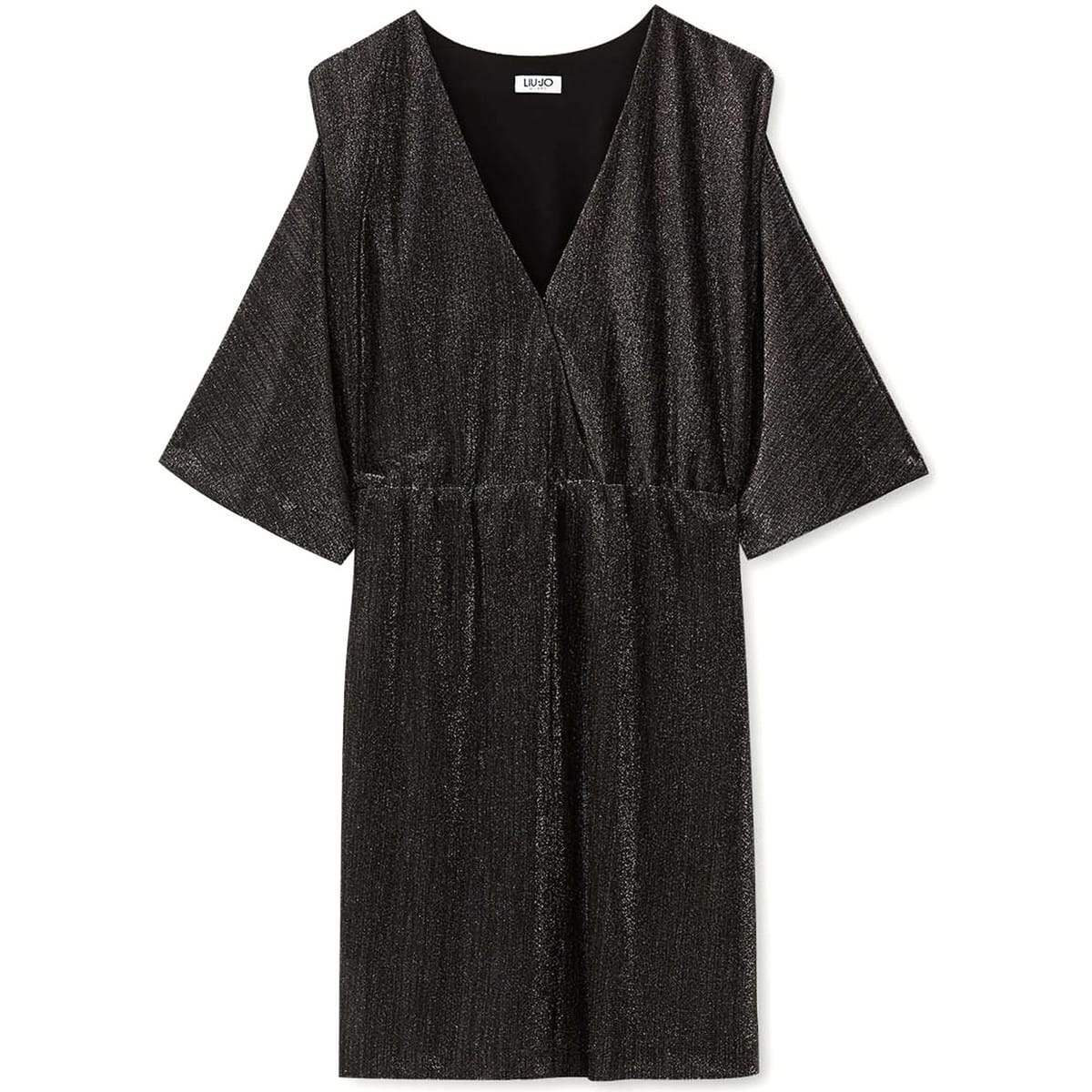Kort kleedje van Liu Jo. Deze jurk is gevoerd en heeft een hoge, elastische taille en een V-hals die sluit met een drukknopje. De jurk is gemaakt van een dunne metallic stof bestaande uit een grijze basis met zilver.