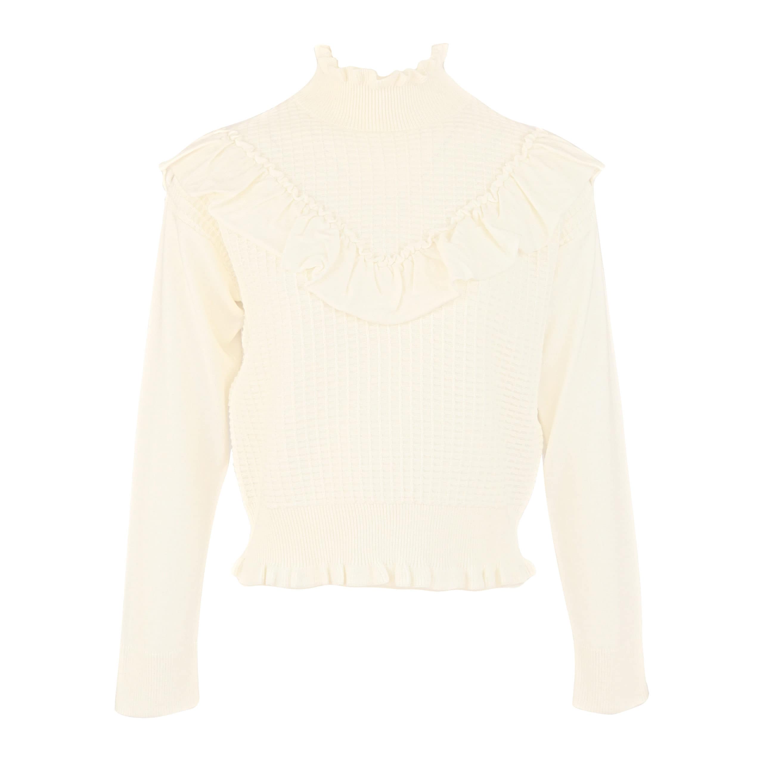 Off white pull van Liu Jo. Deze trui heeft een korte, normale pasvorm, is gemaakt van een wolmix en heeft een wafelstructuur. De trui heeft een opstaande golvende hals, golvende zoom en aan de voorzijde elegante ruches.