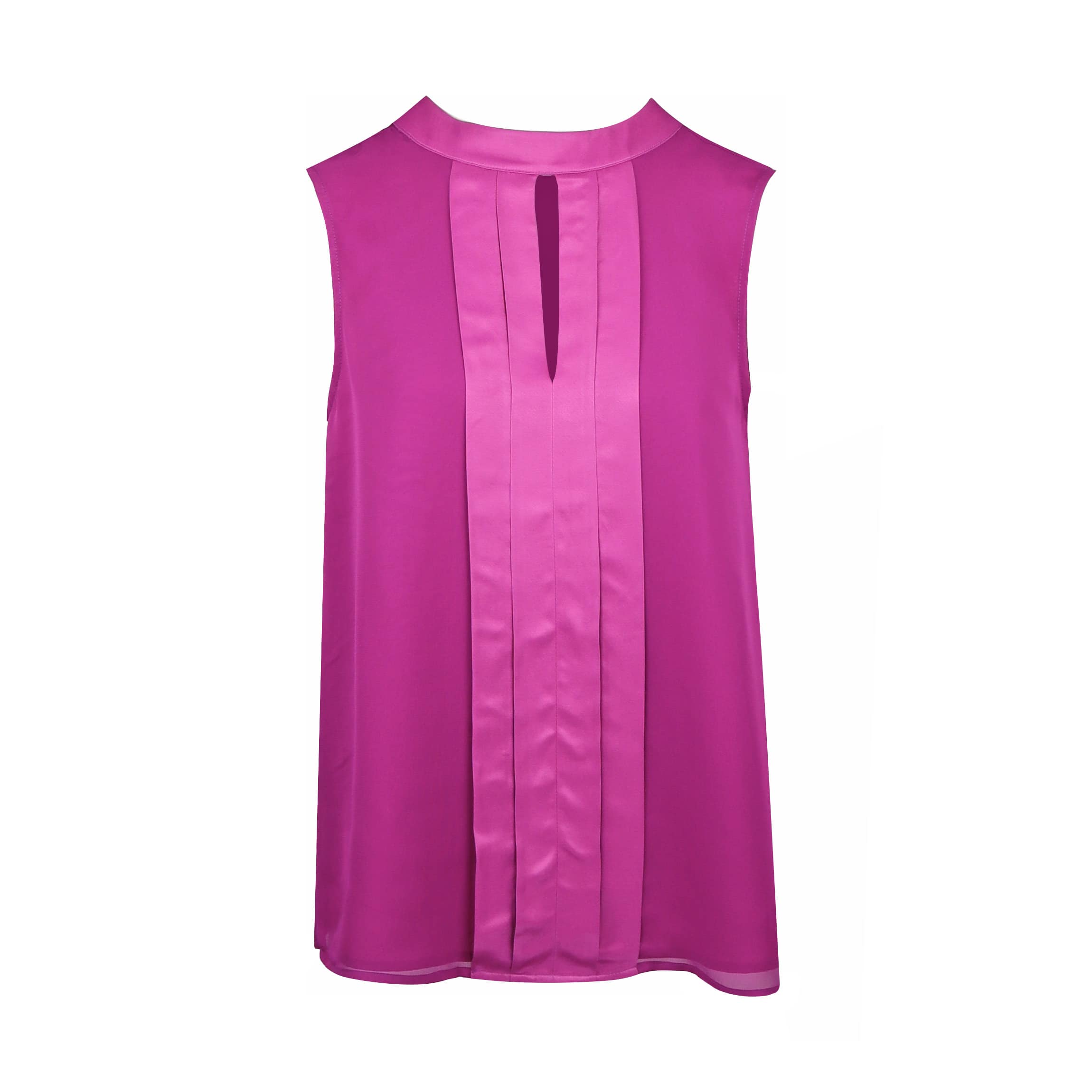 Paarse top van Liu Jo, model ECS top ts nav. Deze top is mouwloos en heeft aan de voorzijde satijnen stroken en een insnede. De top is gemaakt van doorschijnende crêpe stof die aan de voorzijde gevoerd is, heeft een losse pasvorm en sluit aan de achterzijde met satijnen linten.