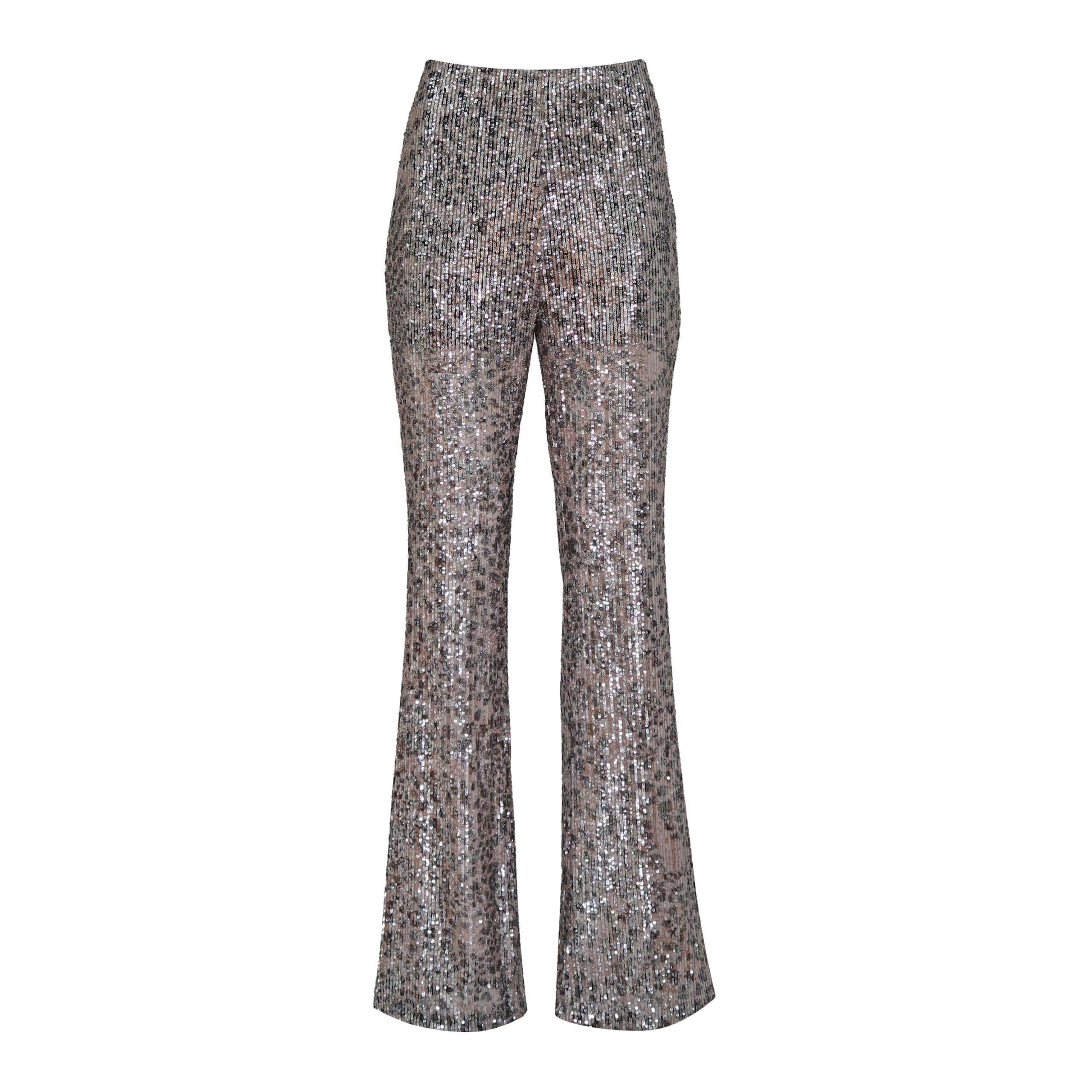 Flared pantalon met pailletten van Liu Jo, model pant. jersey lungo in natural fall spots. Deze broek is geheel bezet met pailletten met een panterpatroon, heeft een slim fit pasovrm met een hoge taille. De pantalon heeft een korte binnenbroek, sluit met een ritssluiting aan de zijkant en heeft lange uitlopende broekspijpen.