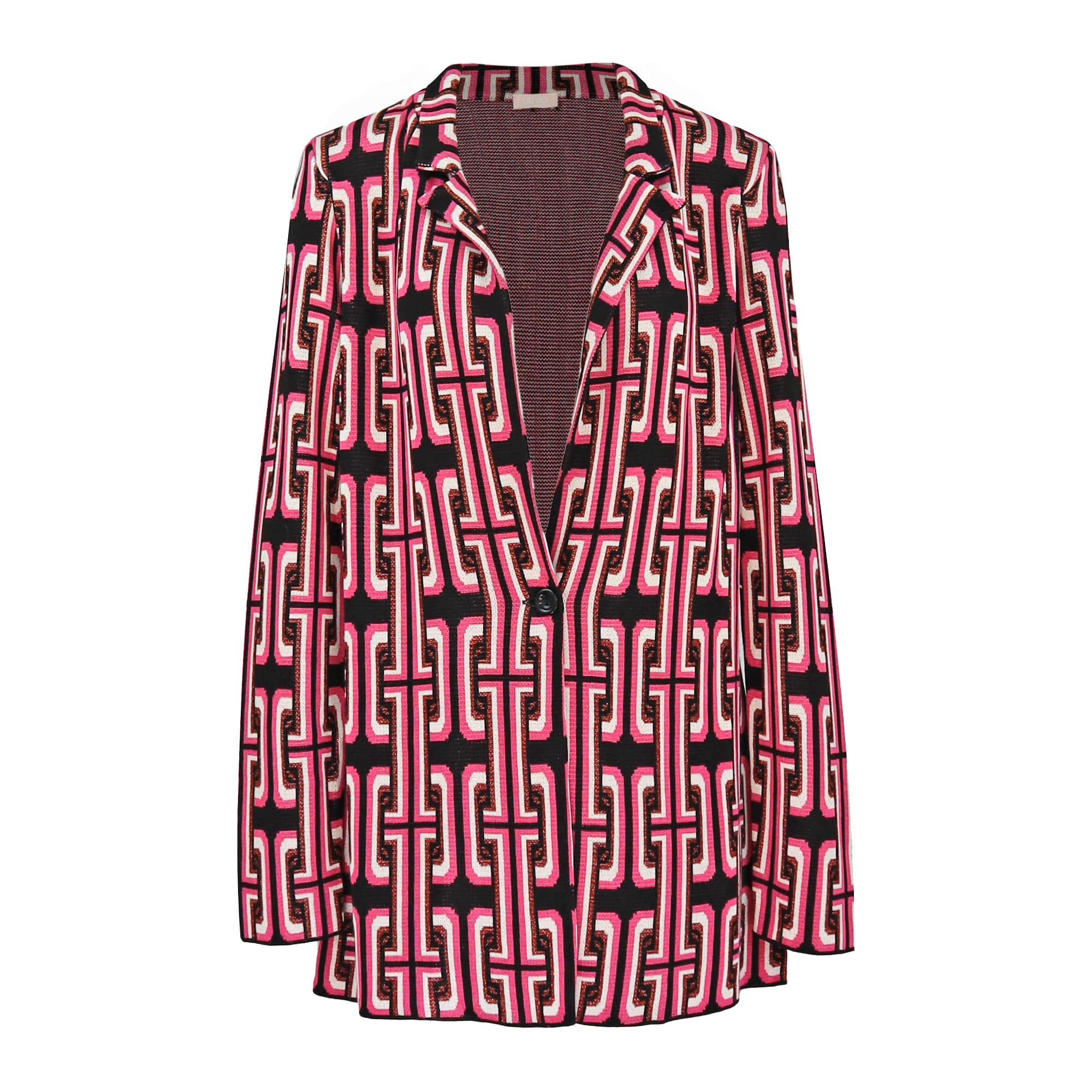 Relaxt fijngebreid jasje van Liu Jo, model giacca maglia jacqua in black geometric. Dit jasje is gemaakt van een soepelvallende jacquard stof met een zwart met roze motief. Hier doorheen is een metalic draad verweven. Het jasje sluit met een knoop aan de voorzijde, heeft een langere lengte en kleine schoudervullingen.