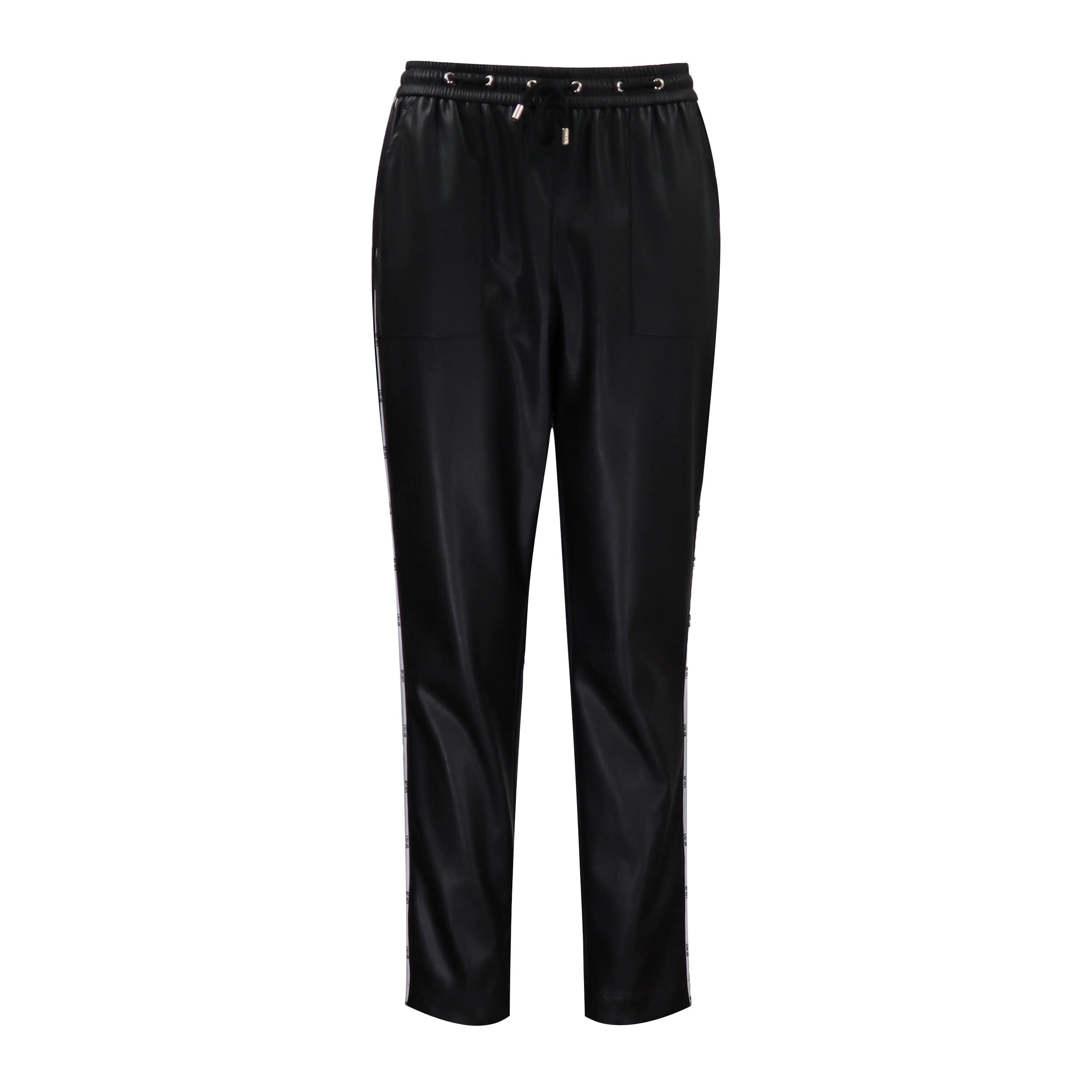 Zwarte faux leather pantalon van Liu Jo, model pant. spalmato. Deze broek heeft een hogere elastische taille met trekkoord en is gemaakt van een leer look stof met aan de zijkant een witte bies met Liu Jo logo. De broek heeft een relaxte pasvorm en twee steekzakken.
