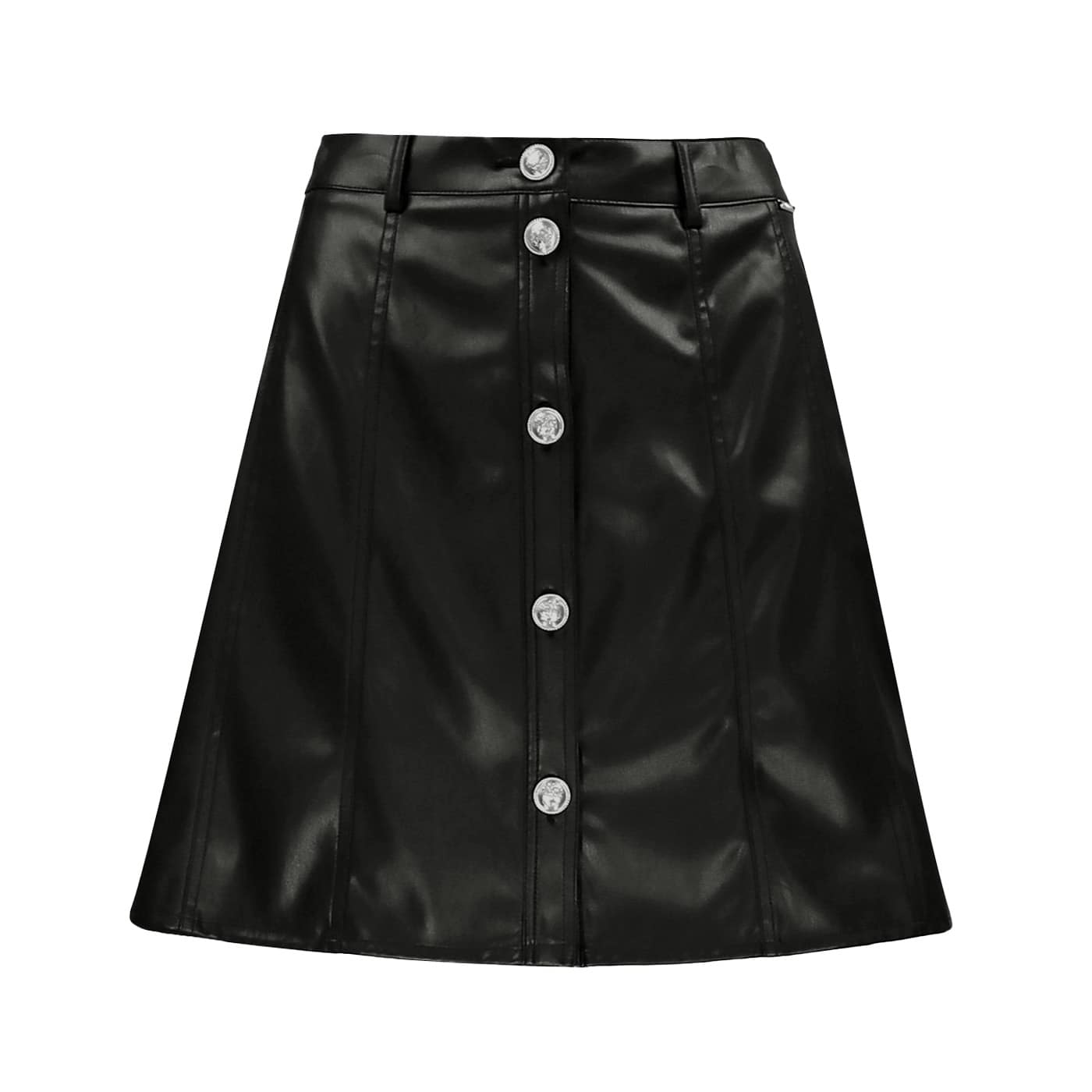 Korte faux leather rok van Liu Jo, model gonna ts nav. Deze rok heeft een hoge taille en sluit met sierlijke Liu Jo knopen aan de voorzijde. De rok heeft een uitlopende pasvorm en een metalen Liu Jo logo aan de zijkant.