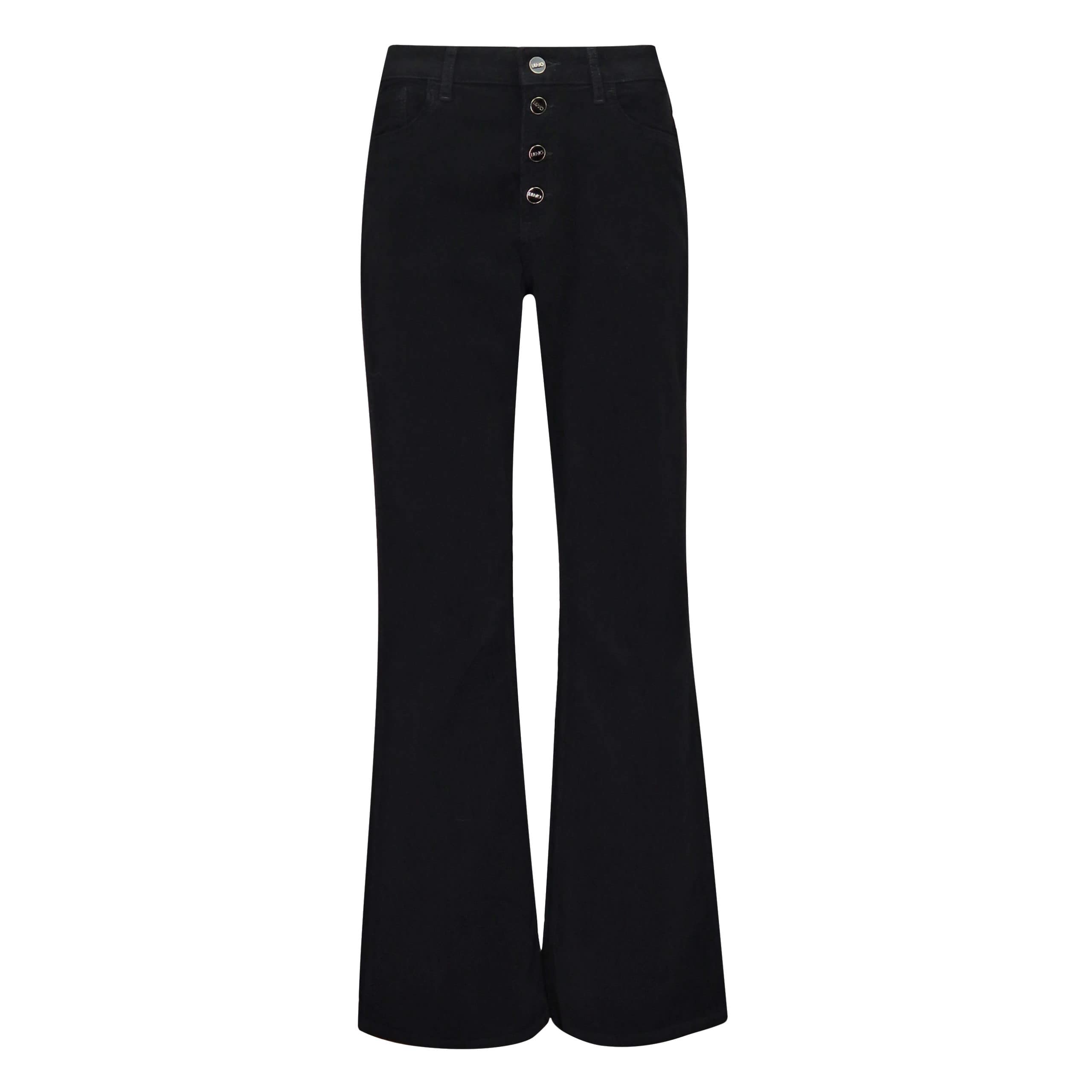 Zwarte fluwelen pantalon van Liu Jo, model pant. zampetta vellut. Deze bootcut broek is gemaakt van een fijn geribbelde zwarte fluwelen stof en heeft een hoge taille. De velvet broek sluit met een zichtbare knoopsluiting, heeft uitlopende broekspijpen, twee steekzakken, en twee achterzakken.