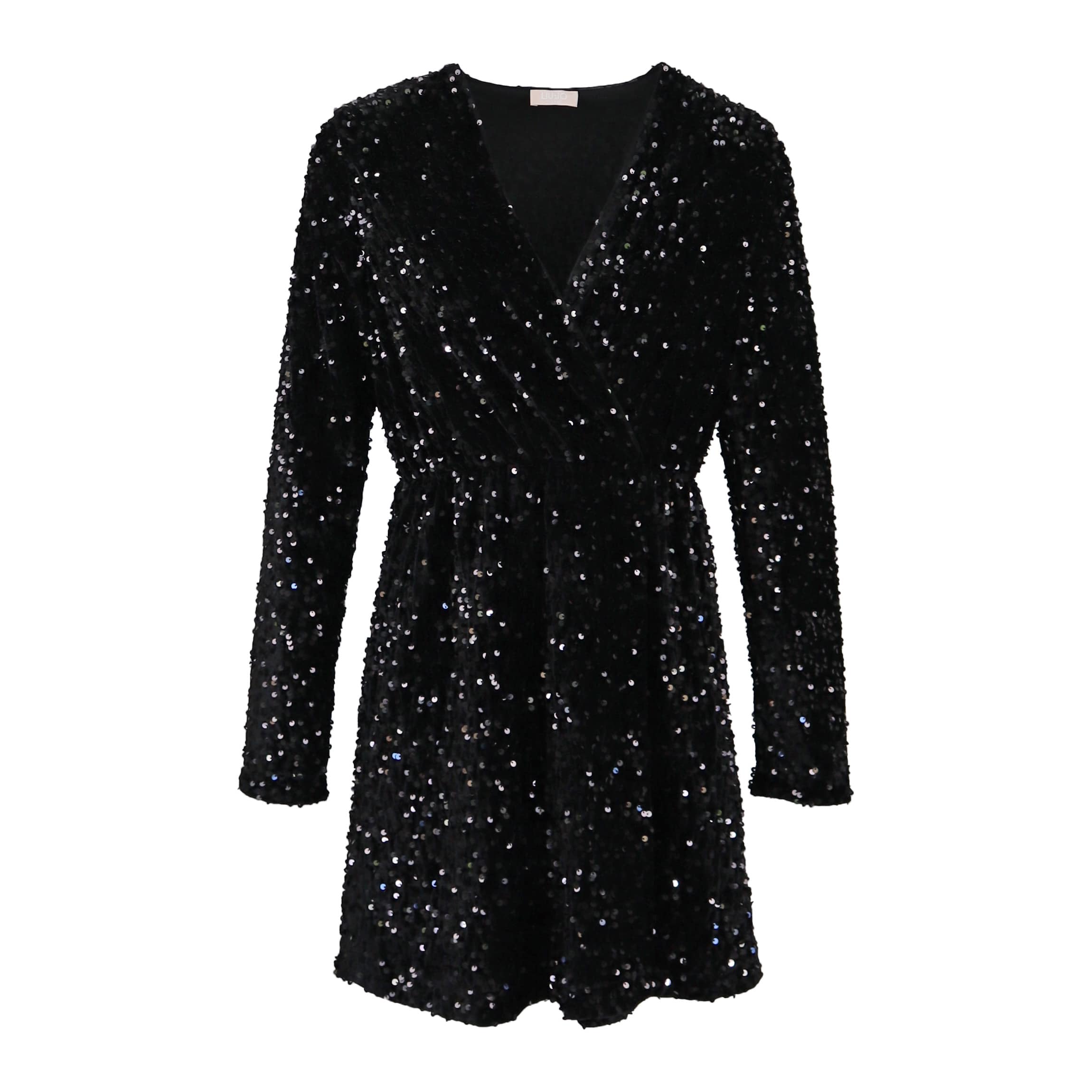 Zwart kleedje van Liu Jo, model Abito velluto + pail. Deze jurk is gemaakt van een zwarte fluwelen stof die overal bezet is met pailletten en heeft aan de voorzijde een overslag. De jurk heeft een elastische taille en valt kort.