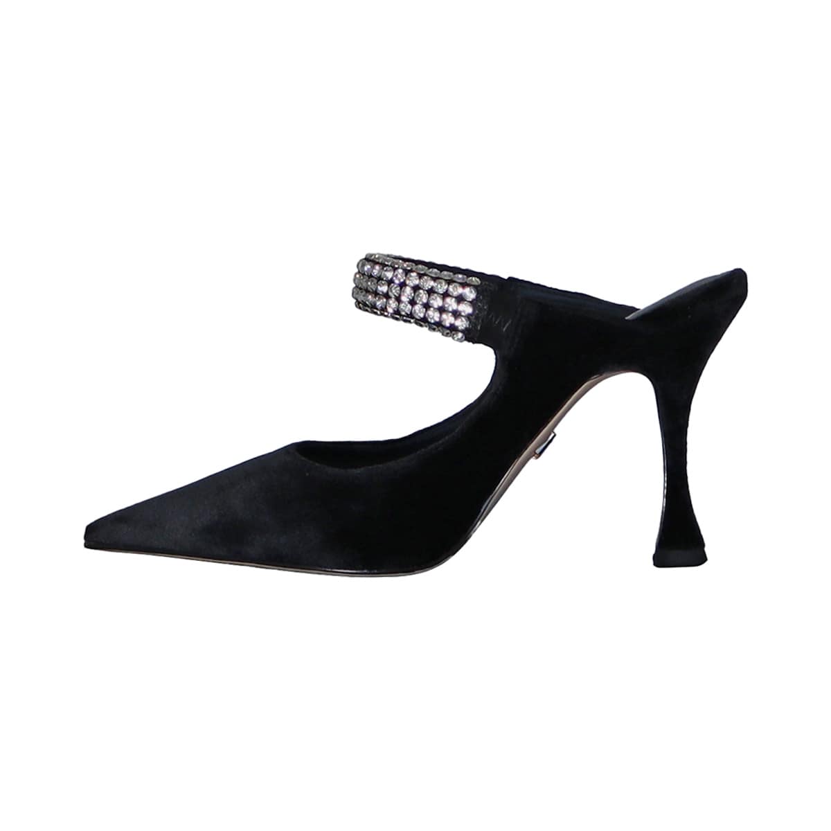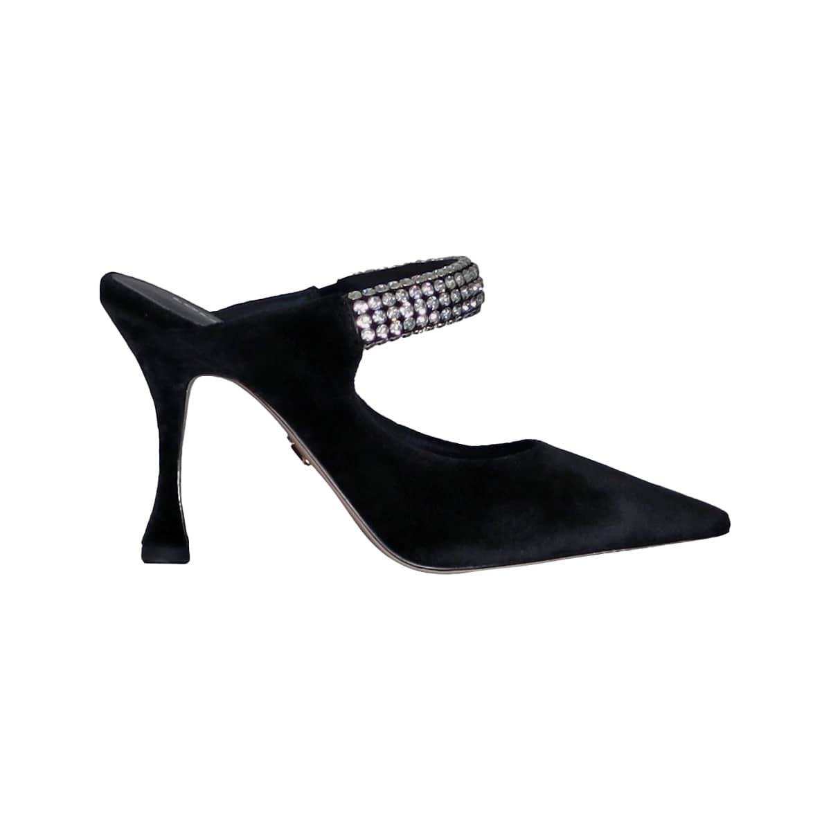 Zwarte fluwelen sandalen van Lola Cruz. Deze sandalen hebben een hak van 8 cm. en een gesloten punt aan de voorzijde. Over de wreef loopt een band die bezet is met steentjes.
