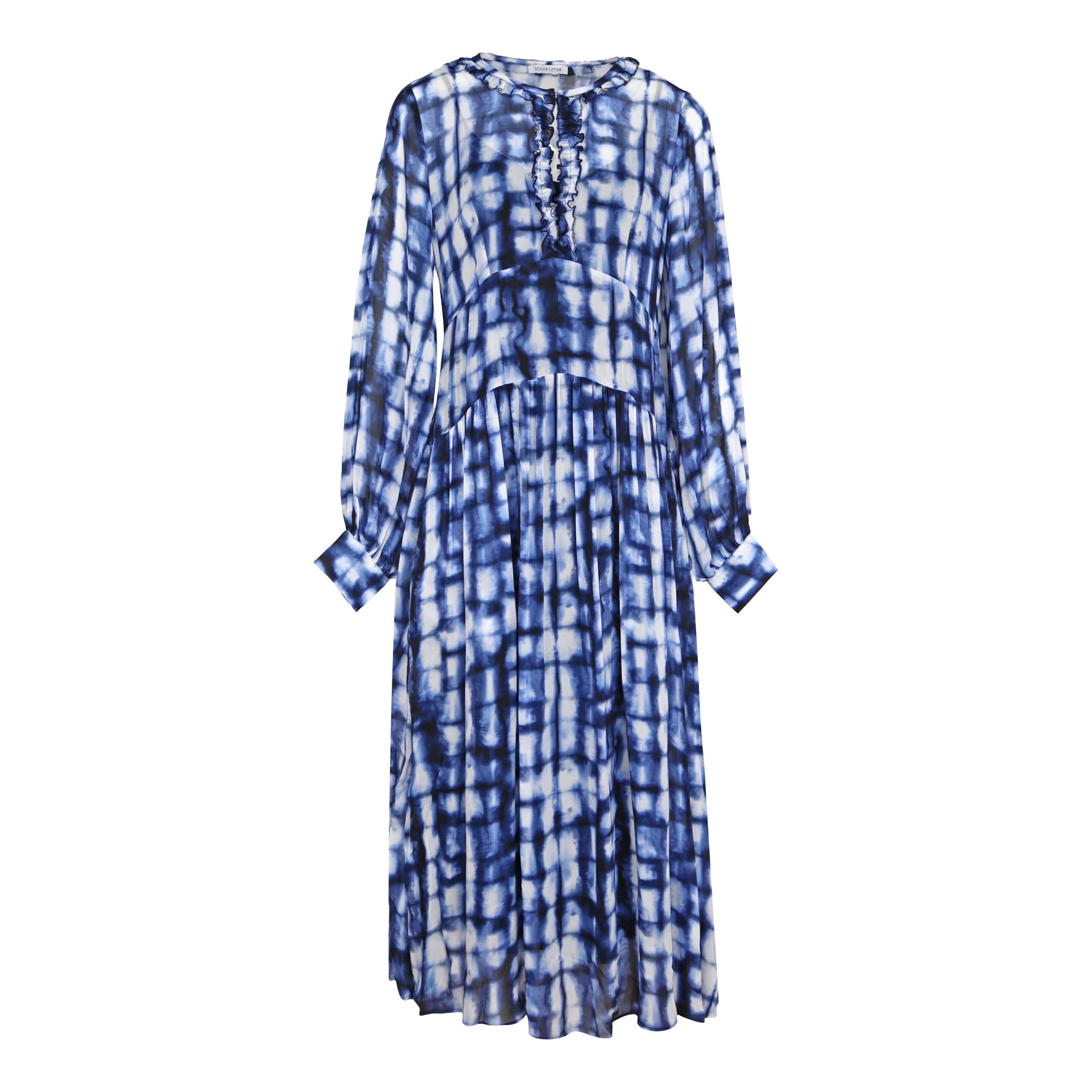 Midi kleedje van Louis and Mia. Deze jurk heeft een donkerblauwe onderjurk en is gemaakt van een blauwe batik stof. De jurk heeft een vrouwelijk insnede aan de hals met ruches en sluit met een klein haakje aan de voorzijde.