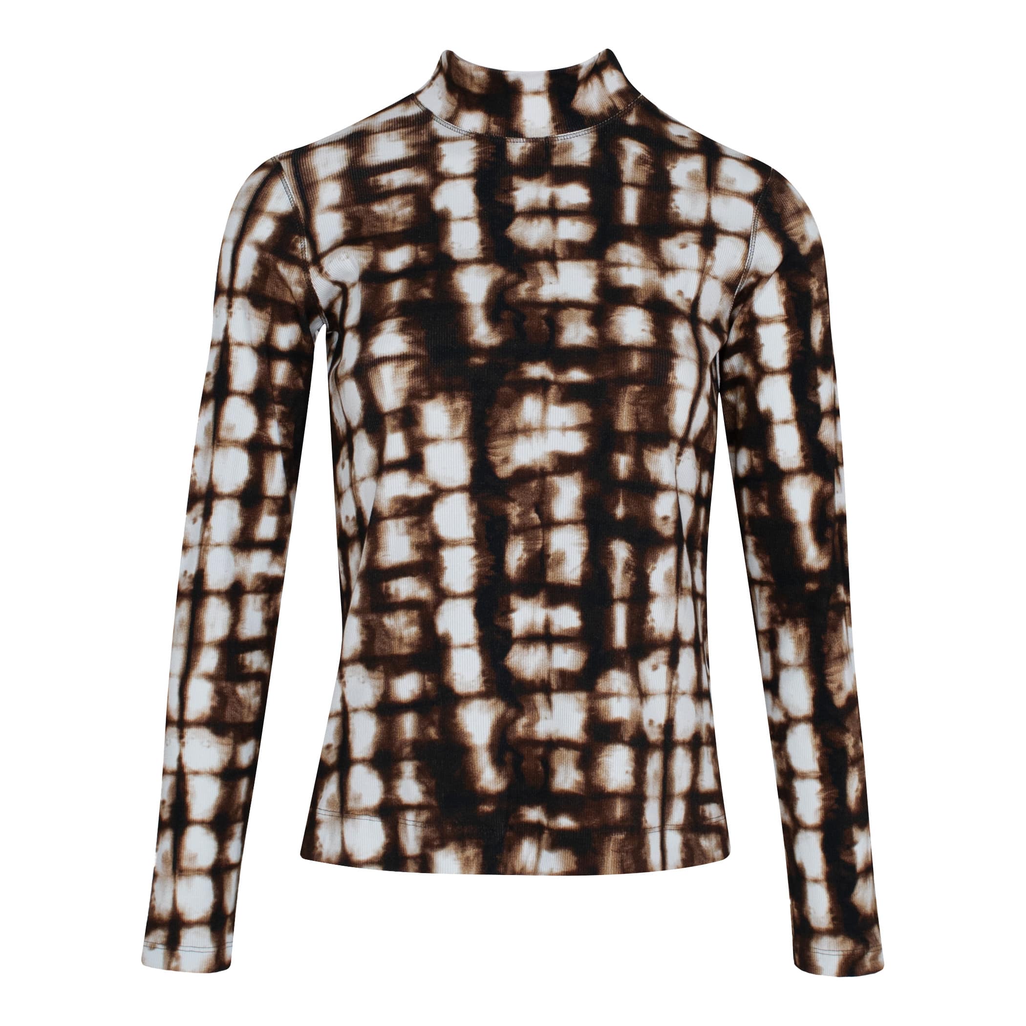 Bruin batik shirt van Louis and Mia. Dit shirt is gemaakt van een geribbelde katoenen stretch stof en heeft een bruine batik print. Het shirt heeft een aansluitende pasvorm, lange mouwen en een col.