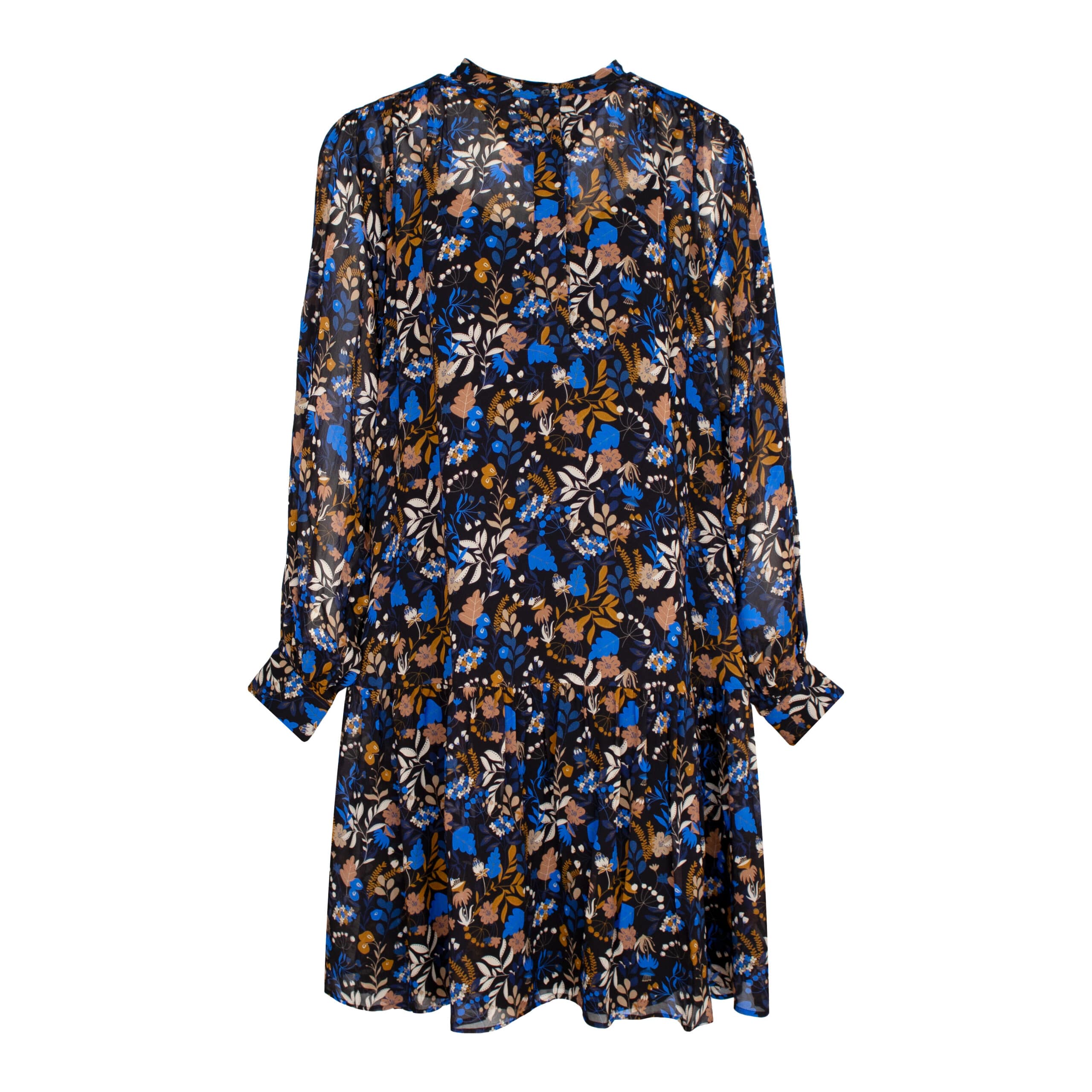 Kort kleedje van Louis and Mia. Deze jurk heeft een losse, zwarte onderjurk, is gemaakt van een licht doorschijnende, zwarte stof met een blauw en bruine bloemen print en valt net boven de knie. De jurk sluit met een korte knoopsluiting in de hals, heeft wijde, lange mouwen, twee steekzakken en heeft een bijpassende ceintuur, zodat je je taille kunt accentueren.