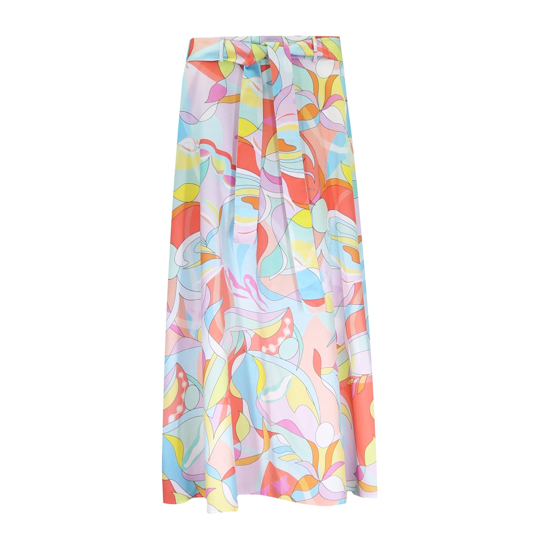 Kleurrijke midi rok van Louis and Mia. Deze rok is gemaakt van een kleurrijke katoenen stof en valt op de kuiten. De rok heeft aan de achterzijde een elastische taille en een bijpassend lint, dat je kunt strikken in de taille of los laten hangen.