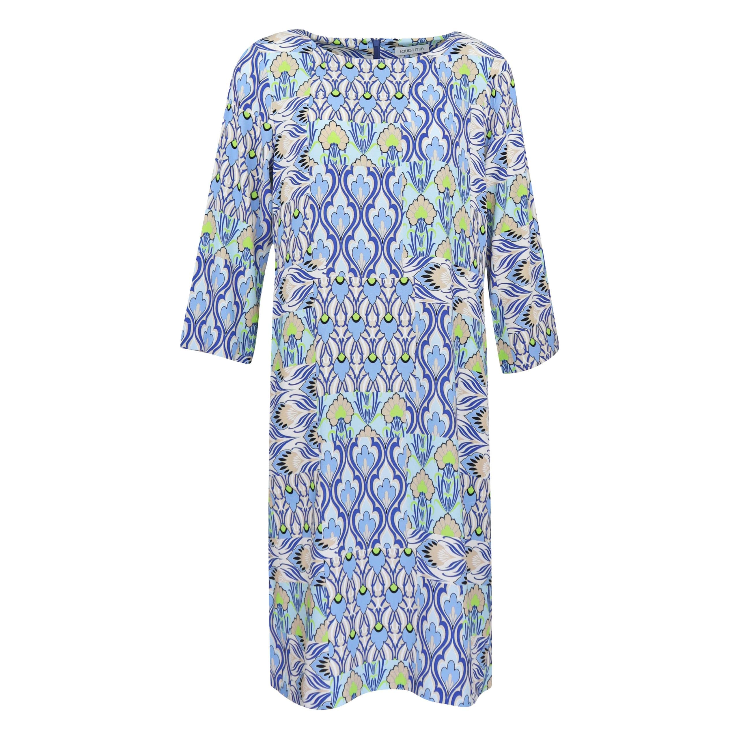 Soepelvallend kleedje van Louis and Mia. Deze jurk heeft een lichtblauw met beige motief en sluit met een verborgen ritssluiting aan de achterzijde. De jurk heeft lange mouwen, steekzakken, een ronde hals, licht uitlopende pasvorm en valt op de knieën.