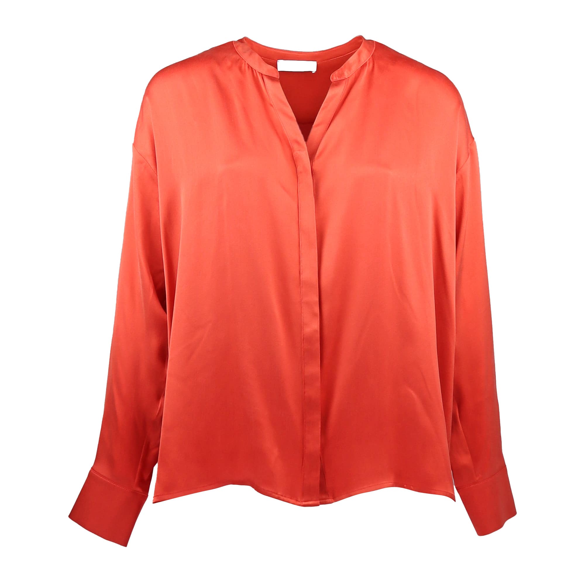 Oranje zijden blouse van Louis and Mia. Deze blouse is gemaakt van zijde met stretch en valt aan de voorzijde korter dan de achterzijde. De blouse sluit met een verborgen knoopsluiting aan de voorzijde, heeft een los vallende pasvorm en lange mouwen.