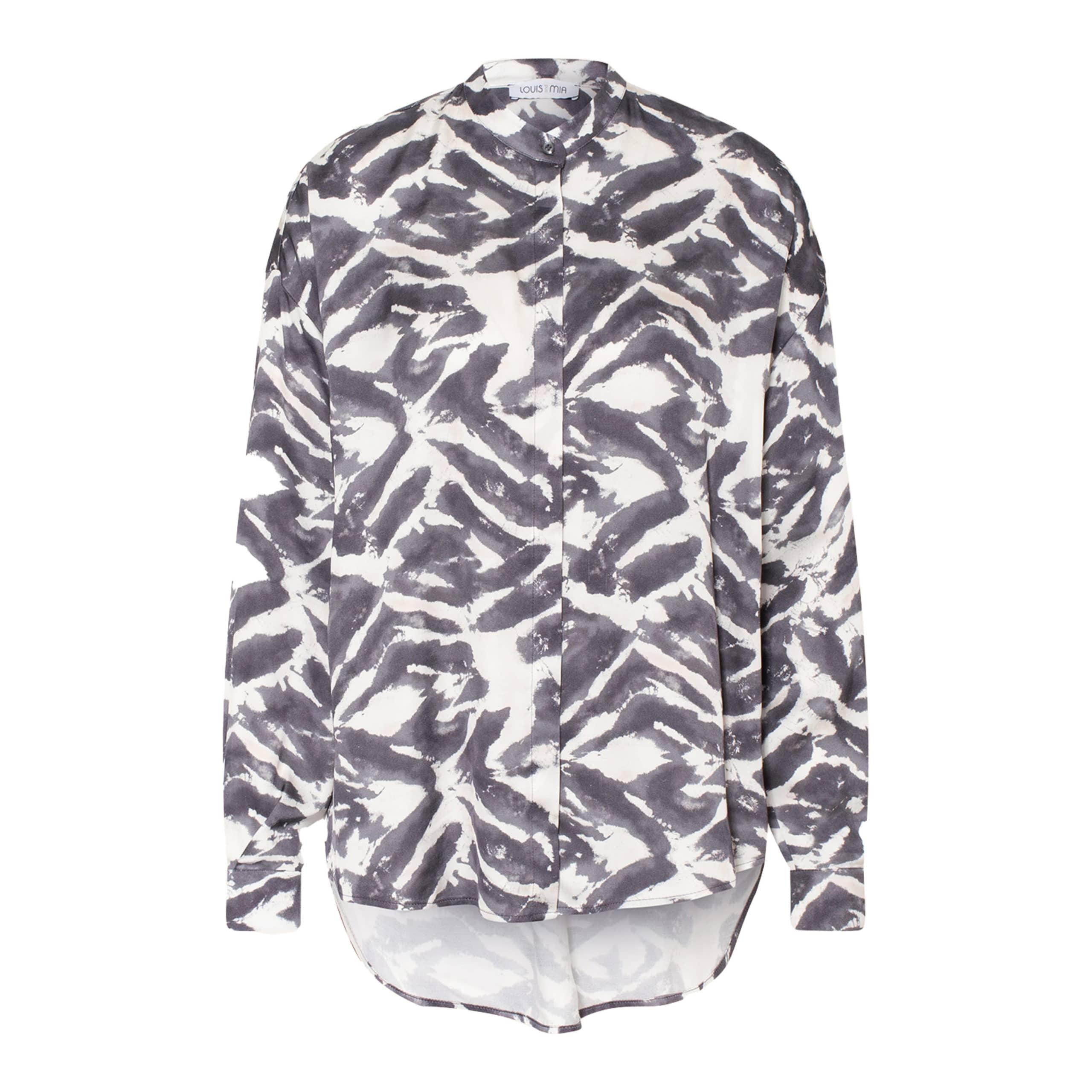Oversized blouse van Louis and Mia. Deze blouse heeft een creme met grijs gestreepte print en sluit aan de voorzijde met knoopjes. De blouse is gemaakt van een verfijnde licht glimmende viscose stof en heeft een mooie ronde halslijn.
