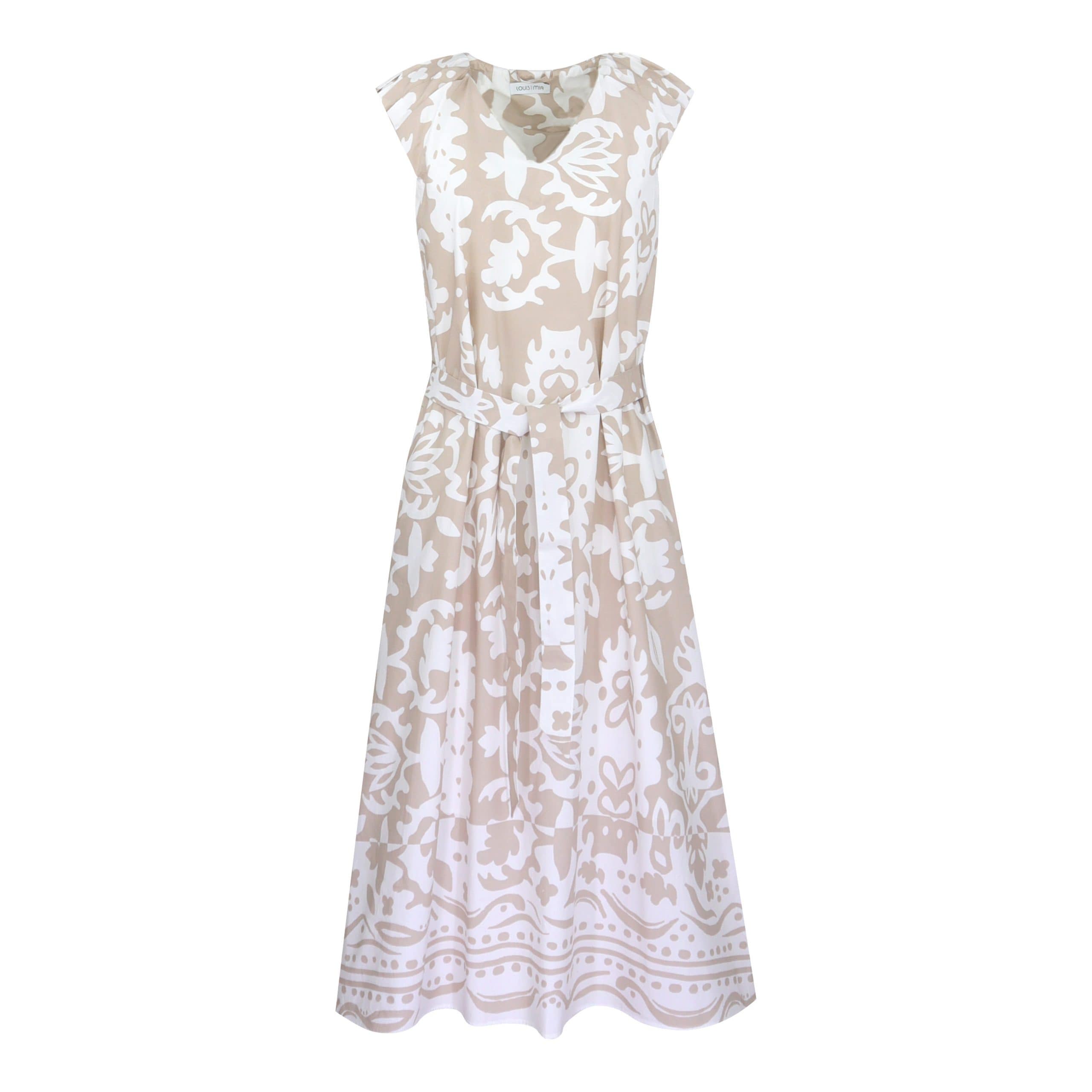 Katoenen kleedje van Louis and Mia. Deze midi jurk heeft een wit met beige print en sluit met een verborgen ritssluiting aan de zijkant. De jurk is mouwloos met plooitjes op de schouders, heeft twee steekzakken, een V-hals, bijpassende ceintuur en valt op de kuiten.
