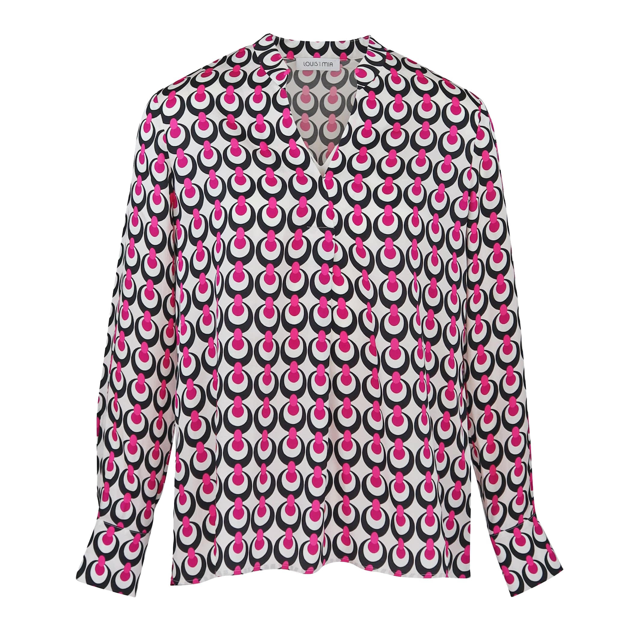 Los vallende blouse van Louis and Mia. Deze blouse heeft een witte basis met een zwart met roze geo tekening en aan de voorzijde een V-insnede. De tuniek is gemaakt van een viscose stof en heeft een rechte pasvorm waarbij de voorzijde iets korter valt dan de achterzijde.
