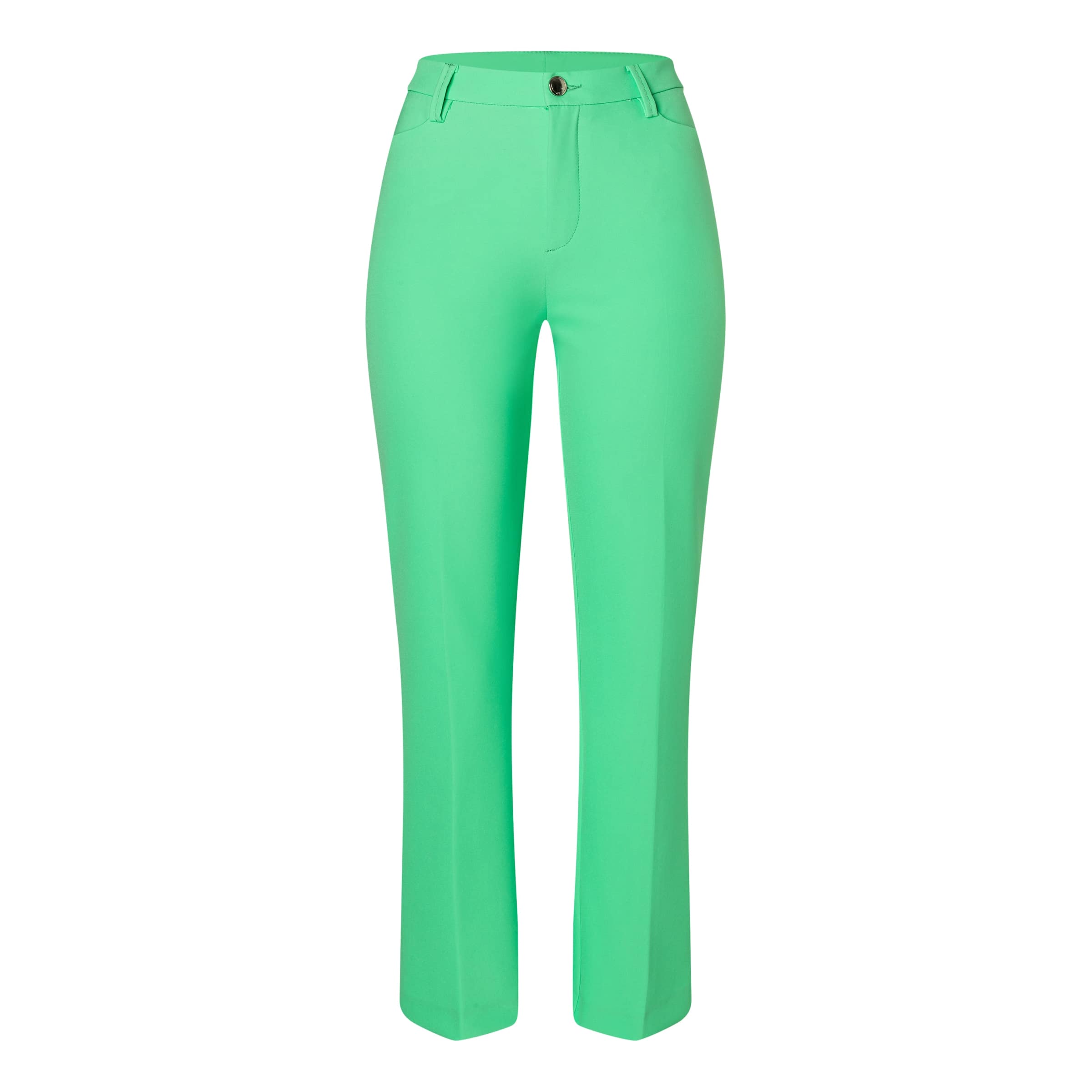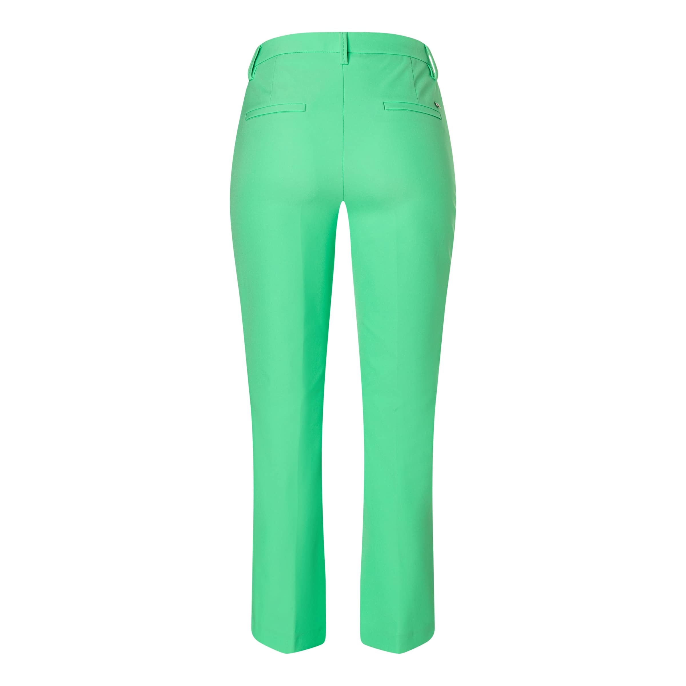 Groene pantalon van MAC, model Aida Kick in spring green. Deze cropped broek heeft een normale taille, twee steekzakken aan de voorzijde, twee sier paspelzakjes aan de achterzijde en sluit met een knoop- en ritssluiting. De pantalon is gemaakt van een soepele stretch stof en heeft flared broekspijpen.