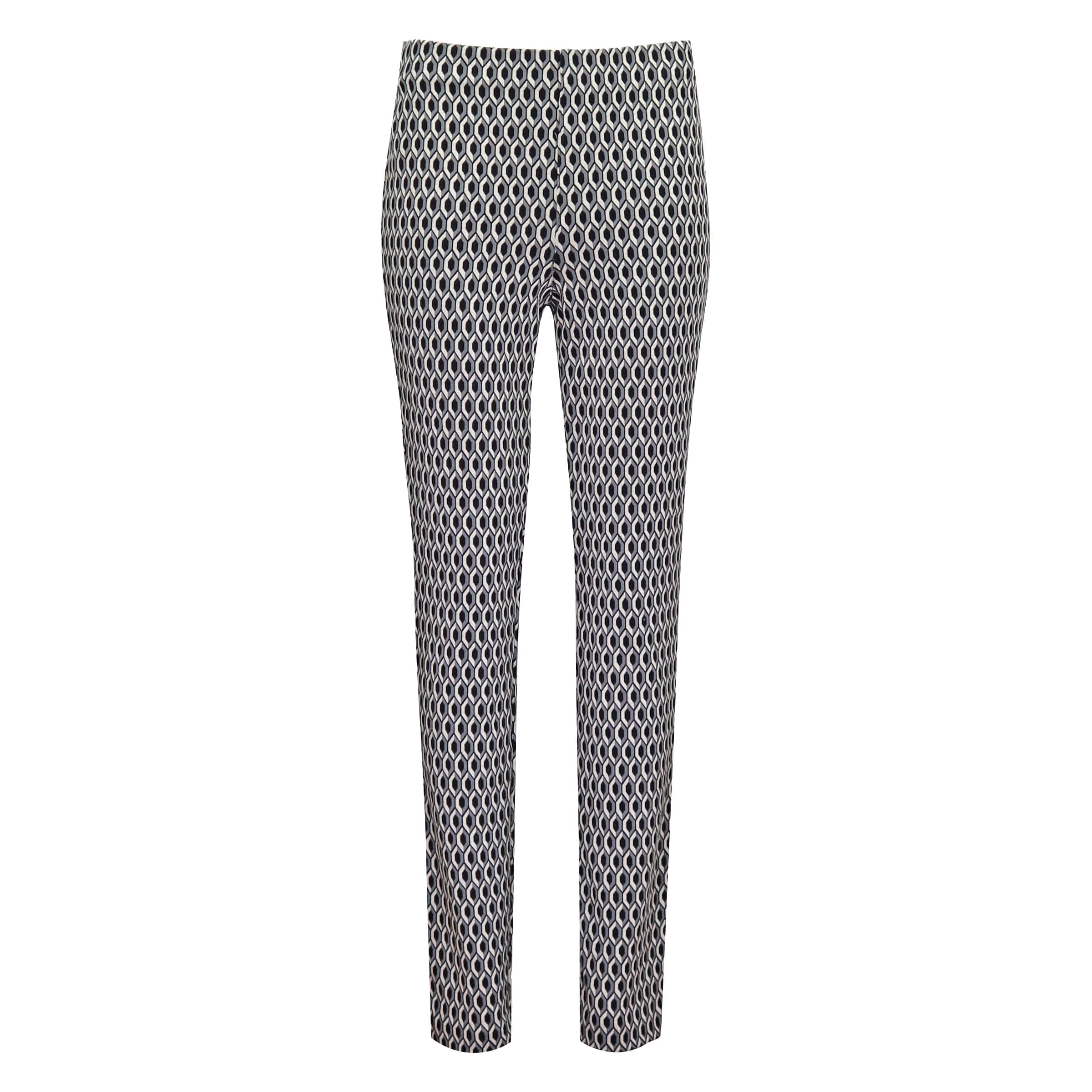 Pantalon met motief van MAC, model Anna jump in. Deze slim fit broek is gemaakt van stretch stof met een zwart, wit, grijs geometrisch motief, heeft toelopende pijpen en valt net boven de enkels. De pantalon heeft een midden hoge taille en een elastische tailleband.