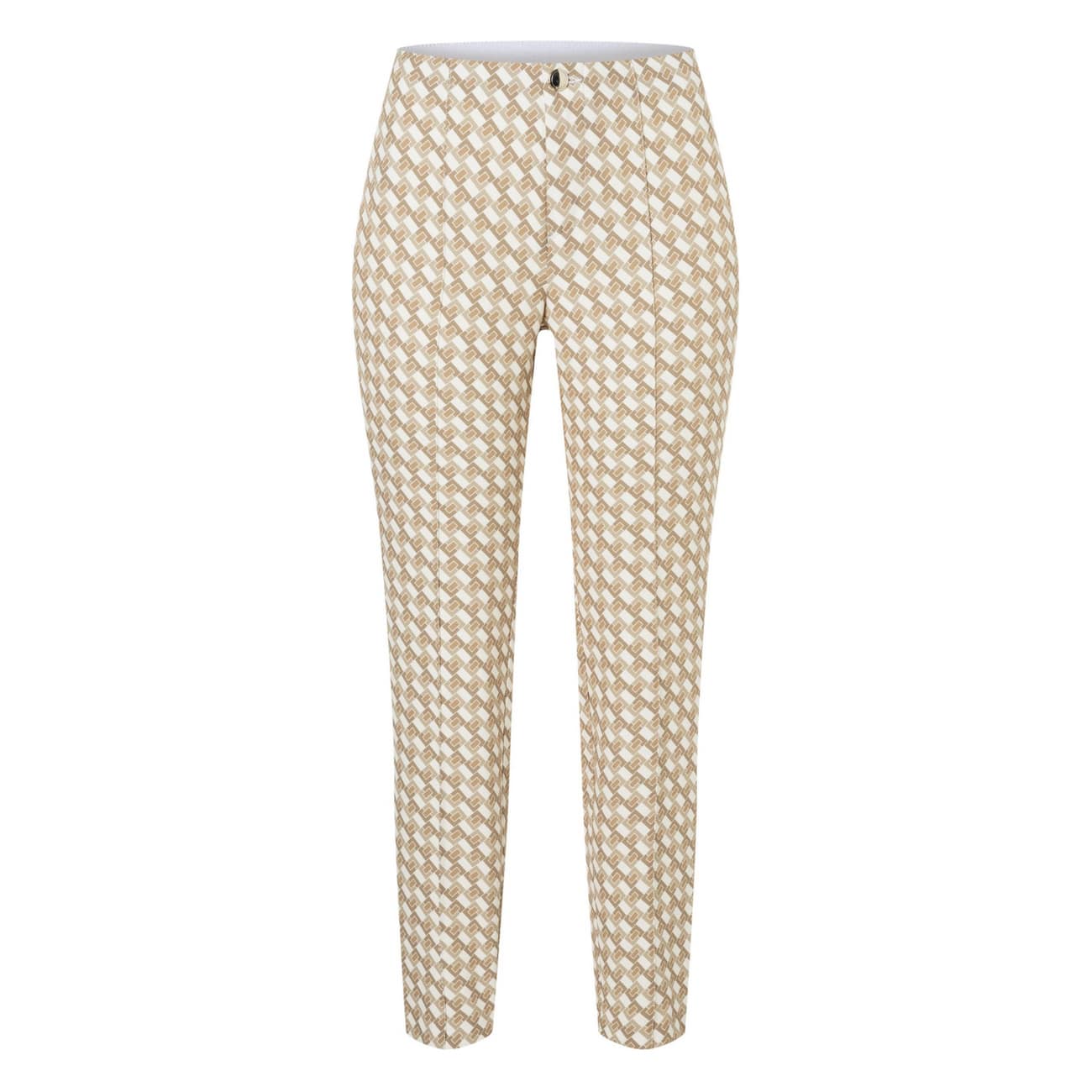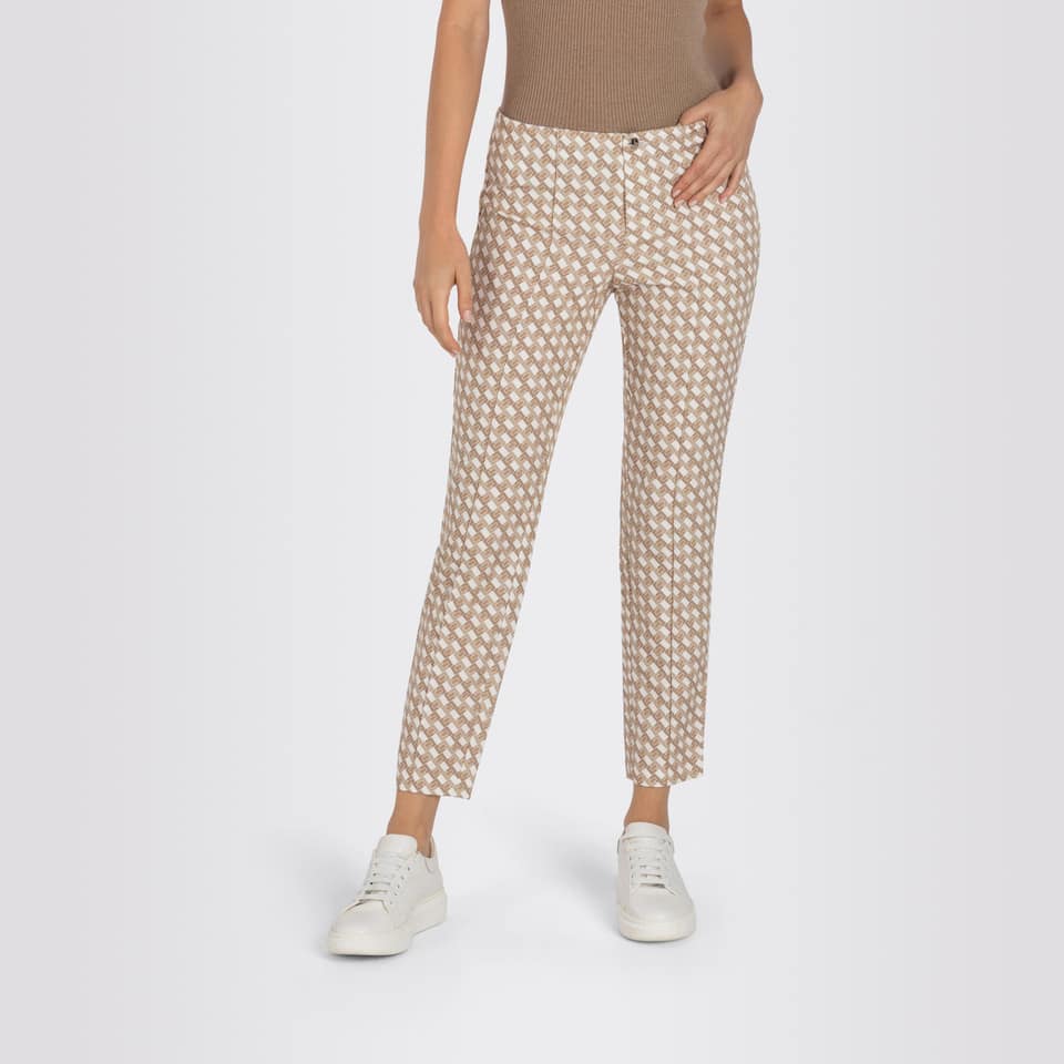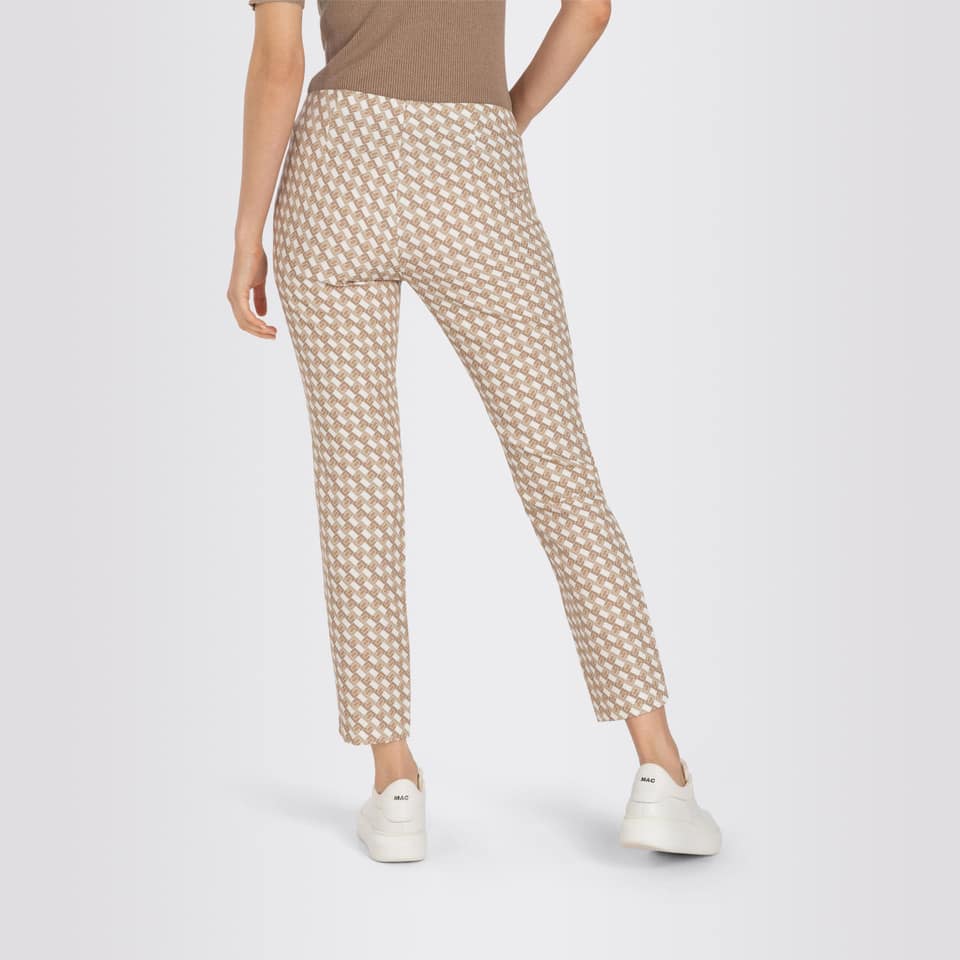 Pantalon van MAC, model Anna. Deze slim fit broek is gemaakt van een gladde stof met een camel met groenkleurig motief, heeft toelopende pijpen, een elastische taille en valt boven de enkels. De broek sluit met een knoop- en ritssluiting en aan de voorzijde loopt er een vaste naad.