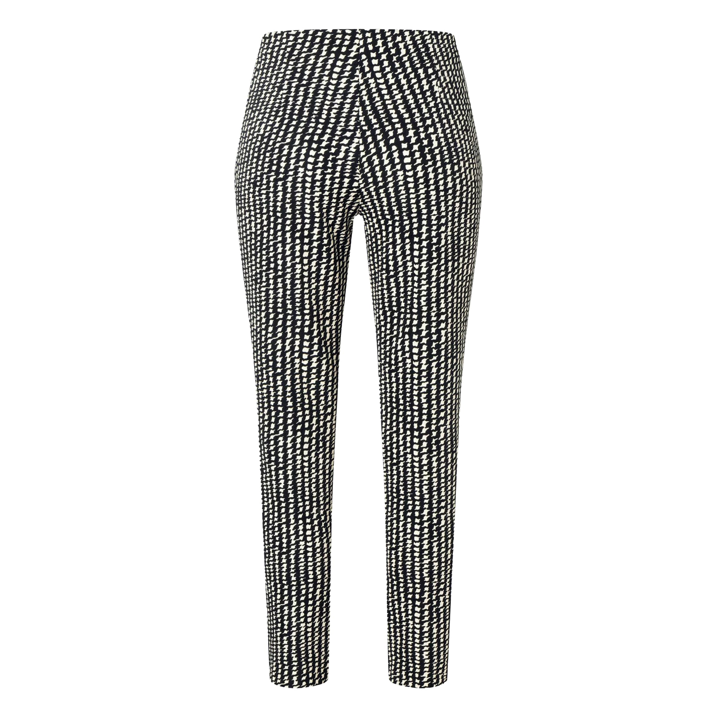 Pantalon van MAC, model Anna. Deze slim fit broek is gemaakt van een gladde stof met een zwart met off white motief, heeft toelopende pijpen, een elastische taille en valt boven de enkels. De broek sluit met een knoop- en ritssluiting en aan de voorzijde loopt er een vaste naad.