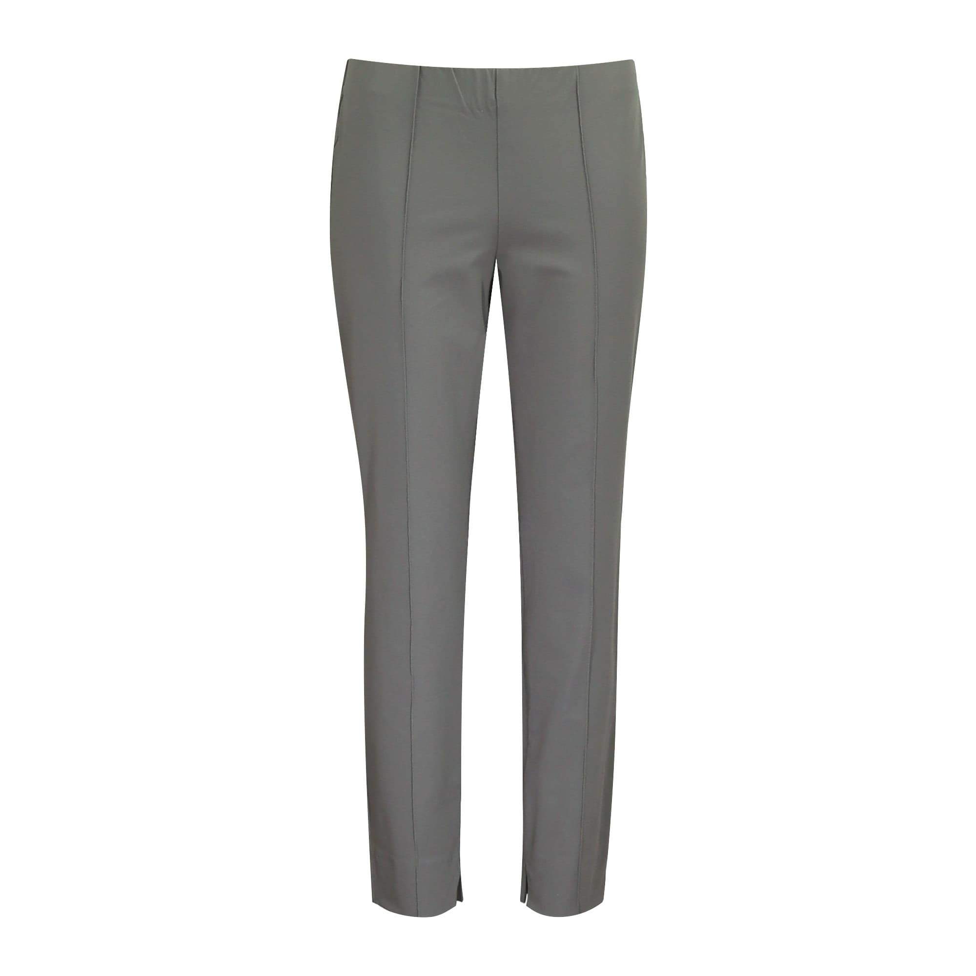 Grijs, groene pantalon van MAC, model Anna Summer. Deze slim fit broek heeft toelopende pijpen, een elastische taille en valt boven de enkels. Aan de voorzijde loopt er een naad over de broekspijpen, waardoor je benen langer lijken.