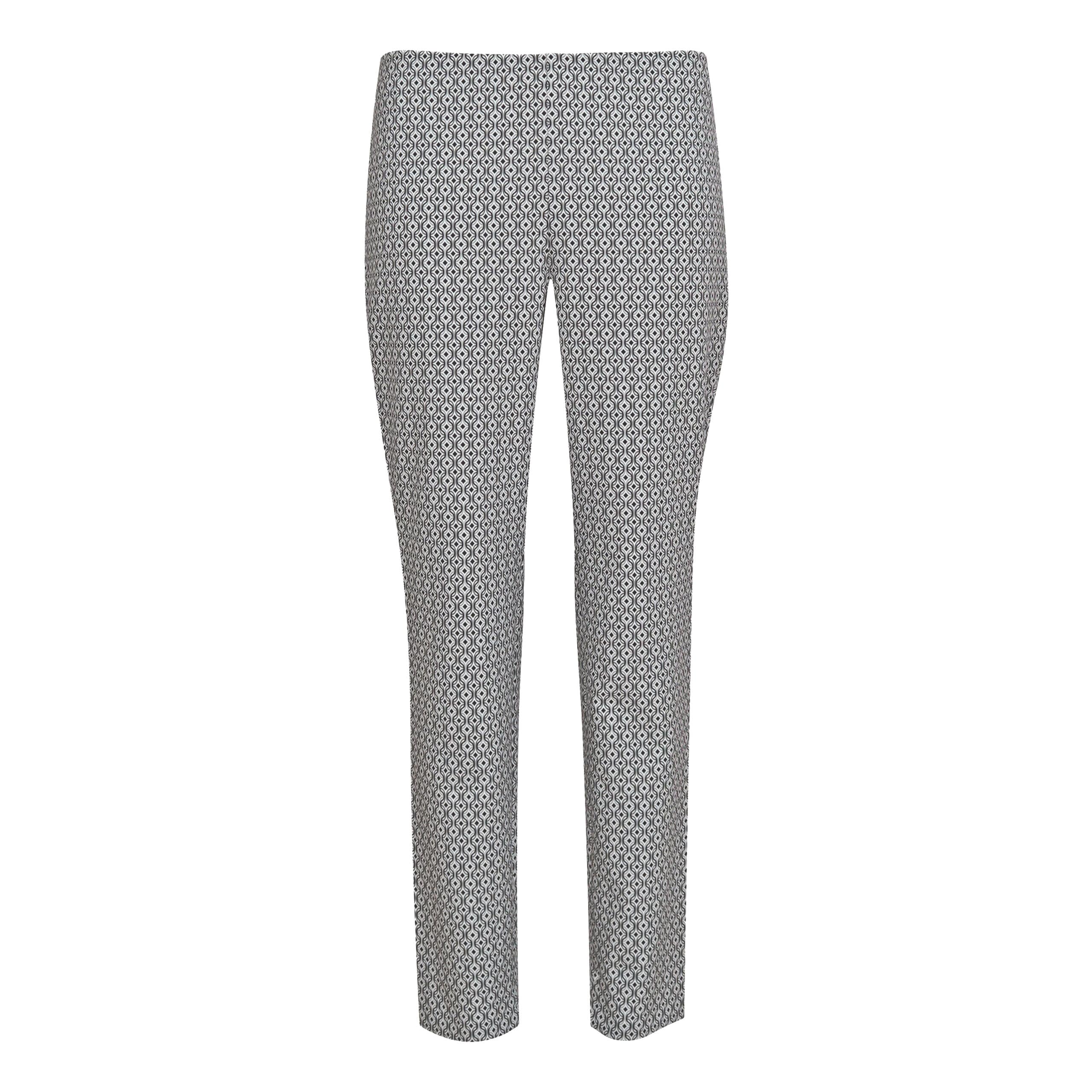 Pantalon met motief van MAC, model Anna Summer. Deze slim fit broek heeft toelopende pijpen, een elastische taille en valt boven de enkels. De pantalon is gemaakt van een gladde stretch stof met een zwart, grijs met wit geografisch motief.