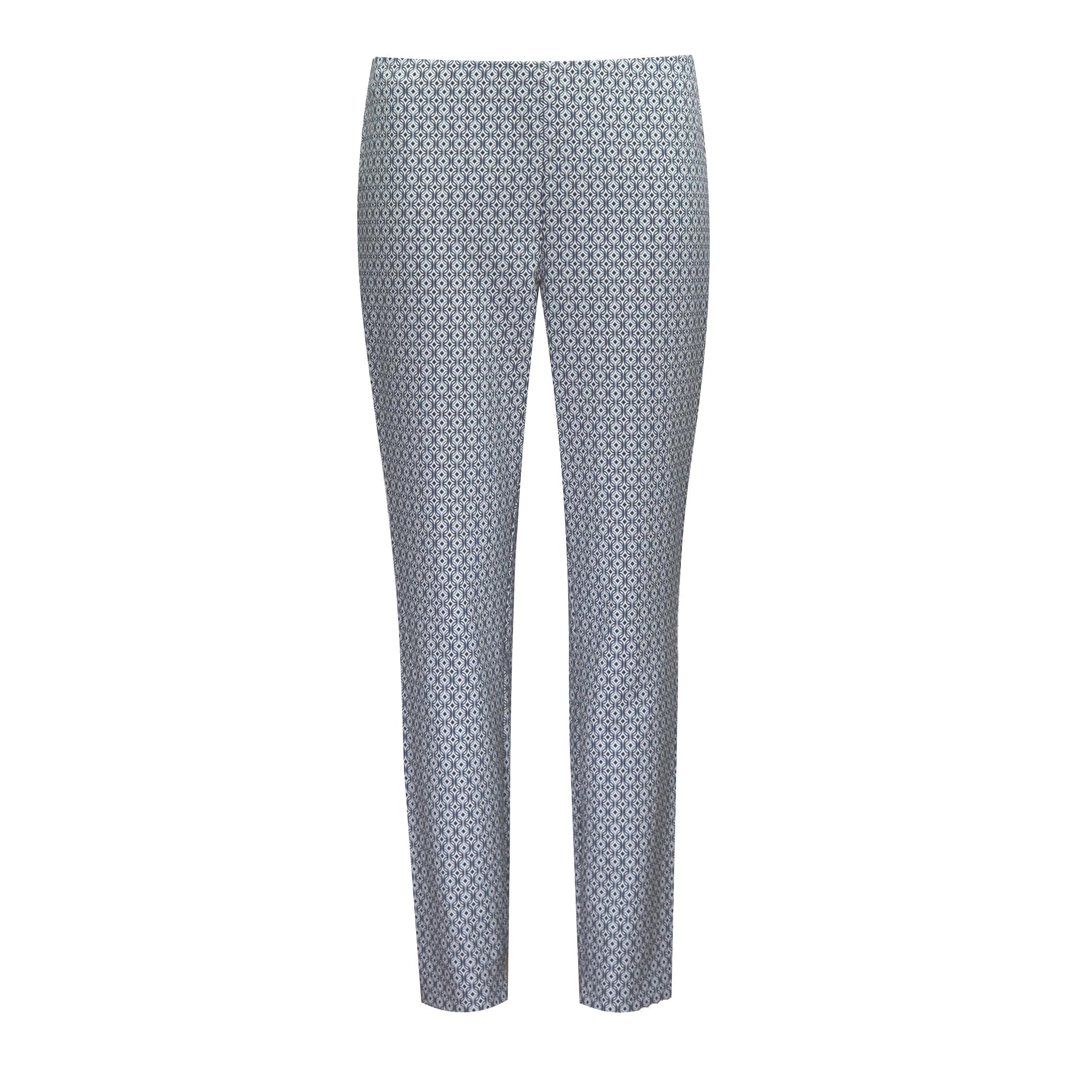 Pantalon met motief van MAC, model Anna Summer. Deze slim fit broek heeft toelopende pijpen, een elastische taille en valt boven de enkels. De pantalon is gemaakt van een gladde stretch stof met een blauw, grijs met wit geografisch motief.