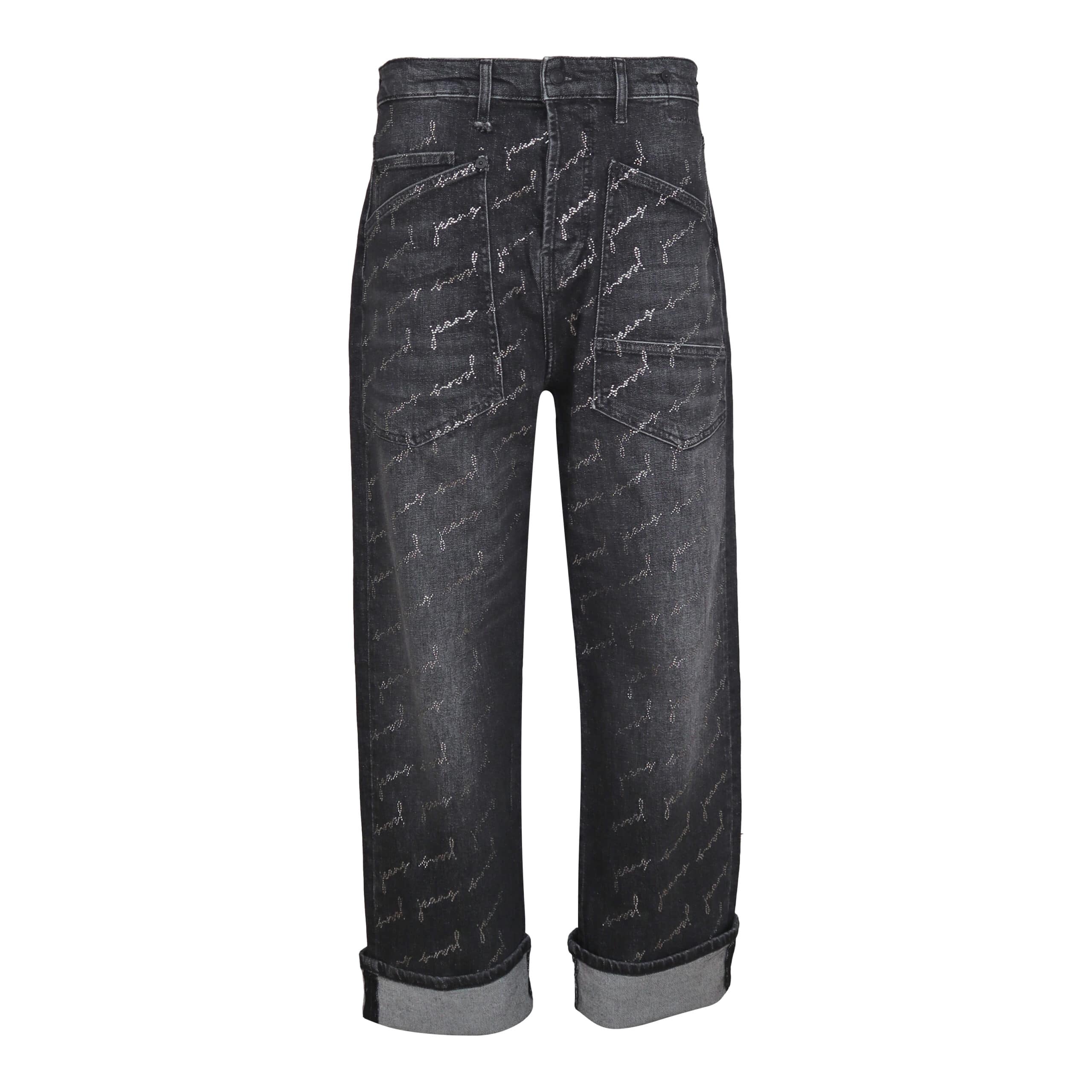 Donkergrijze jeans van MAC, model Baggy straight glam, relaxed fit, straight leg. Deze los vallende broek is gemaakt van stretch denim met op de voorzijde het woord jeans in steentjes en heeft een baggy pasvorm. De broek sluit met een knoopsluiting, heeft een hoge taille, twee steekzakken aan de voorzijde en twee achterzakken.