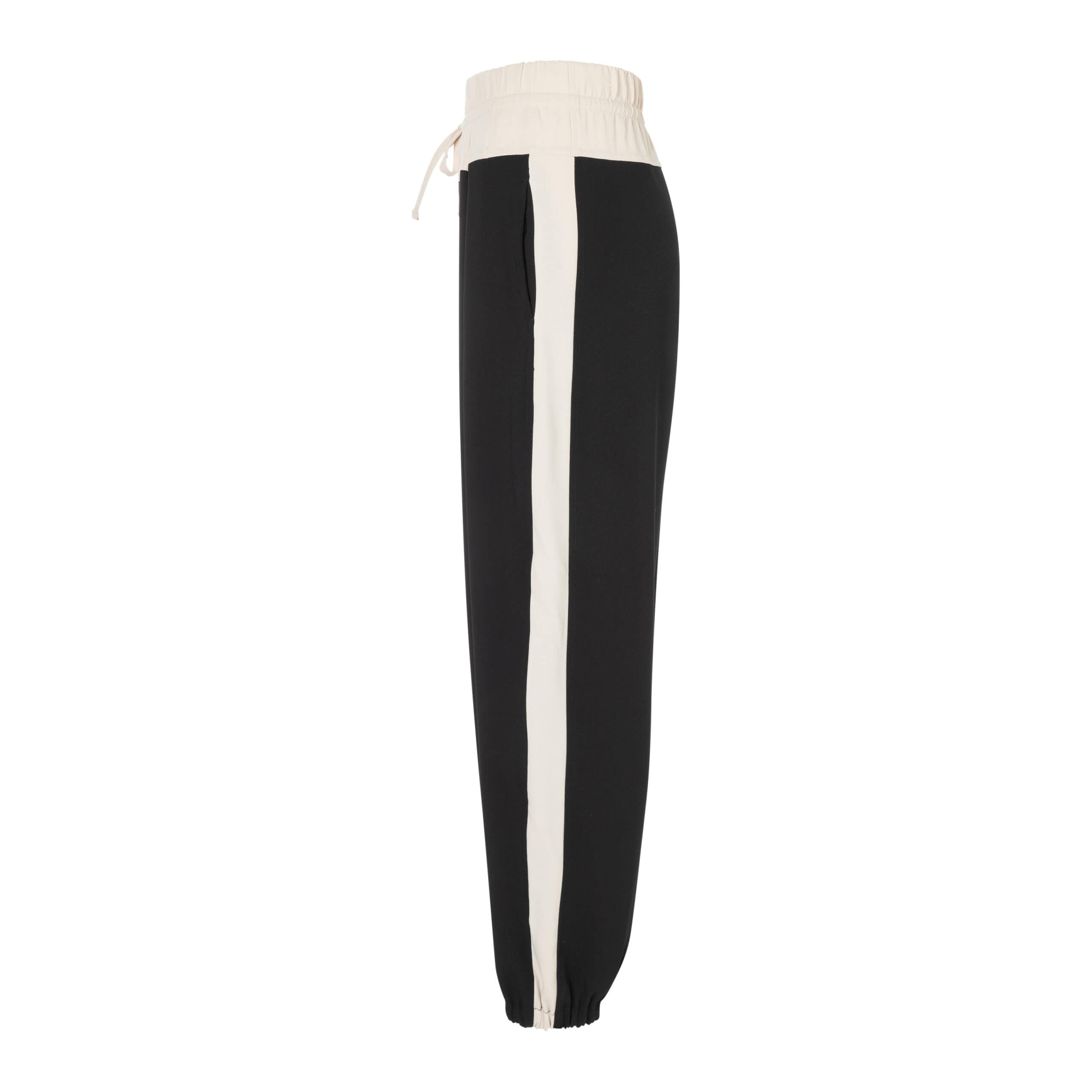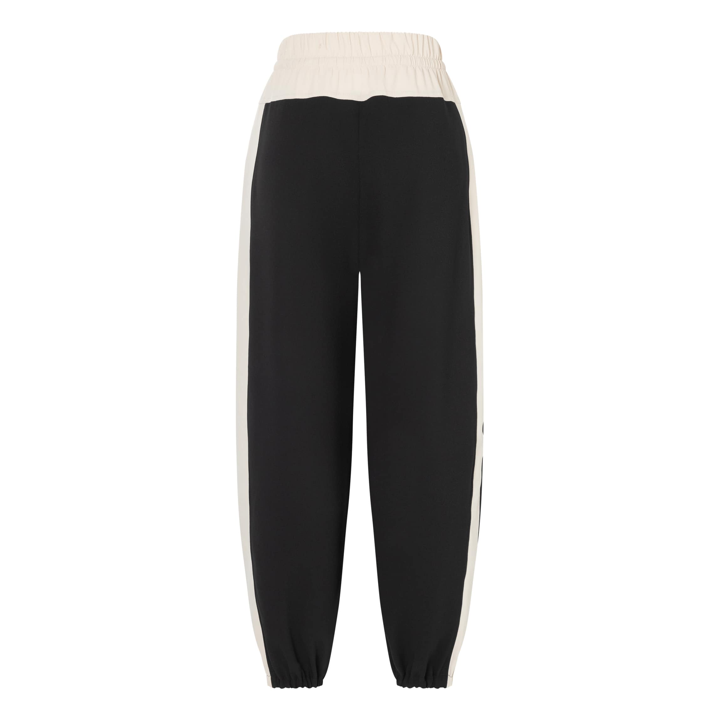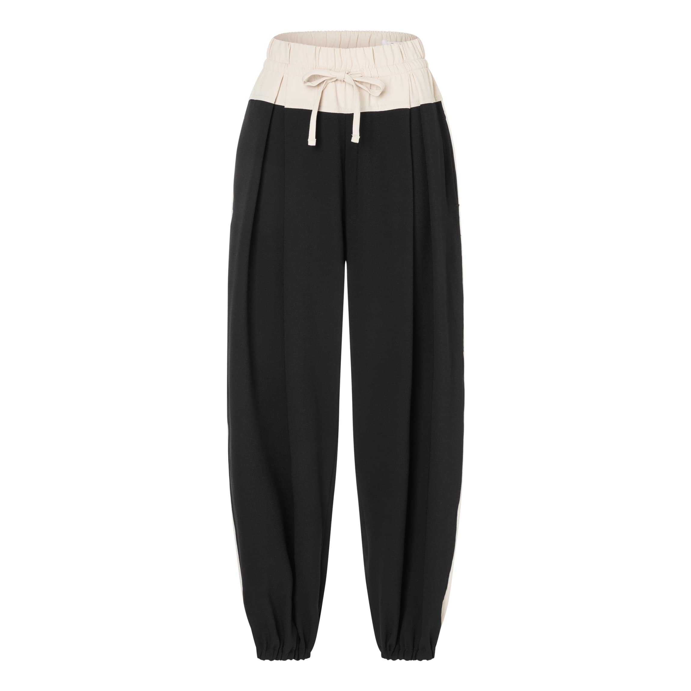 Zwarte pantalon van MAC, model Balloon galloon, relaxed fit. Deze broek is gemaakt van zwarte crêpe stof met een beige bovenband en bies. De broek heeft een balloon leg pasvorm, hoge taille, twee steekzakken en een elastische taille met trekkoord.