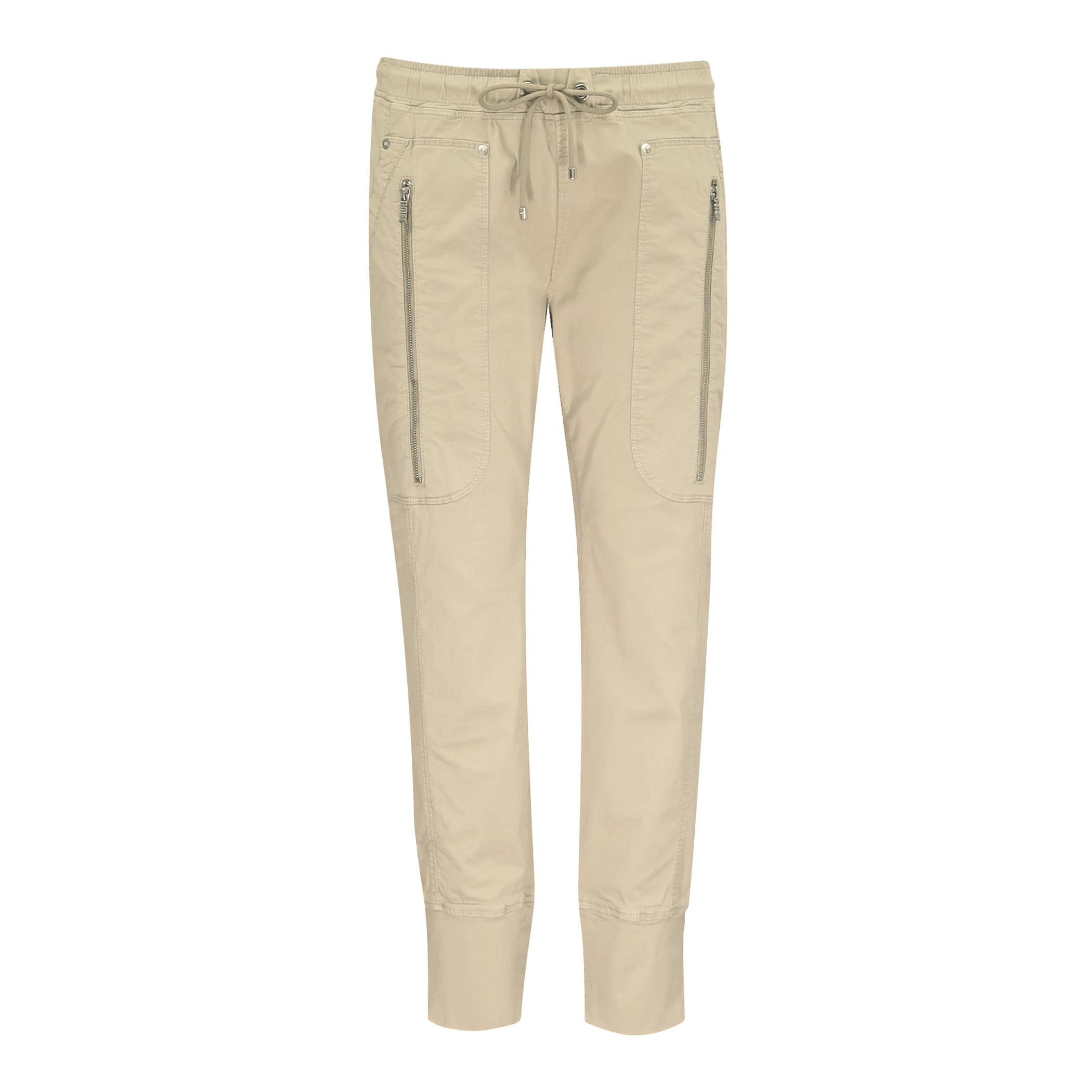 Relaxte pantalon van MAC Jeans, model Future 2.08 casual in golden terra. Deze beige kleurige broek heeft taps toelopende broekspijpen met twee zakken achter ritsjes aan de voorzijde. De broek is gemaakt van een soepel vallende katoenen stretch stof en heeft een elastische tailleband met trekkoord.