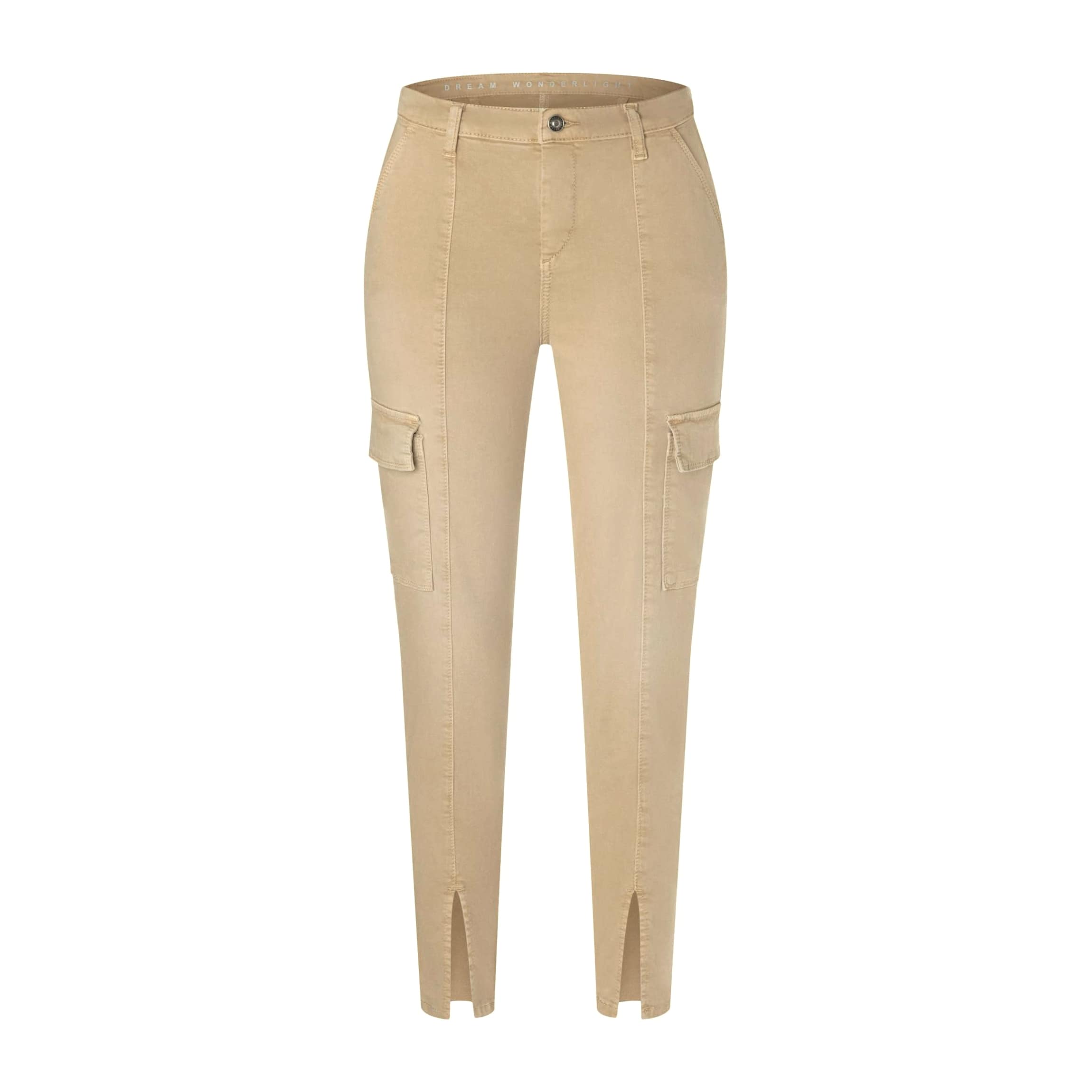 Cargo broek van MAC, model Dream Cargo cotton in beige. Deze katoenen broek heeft op beide broekspijpen cargo zakken en heeft een insnede aan de voorzijde in de zoom. De broek heeft een slim fit pasvorm, verhoogde taille, twee steekzakken en twee sier klepzakken aan de achterzijde.