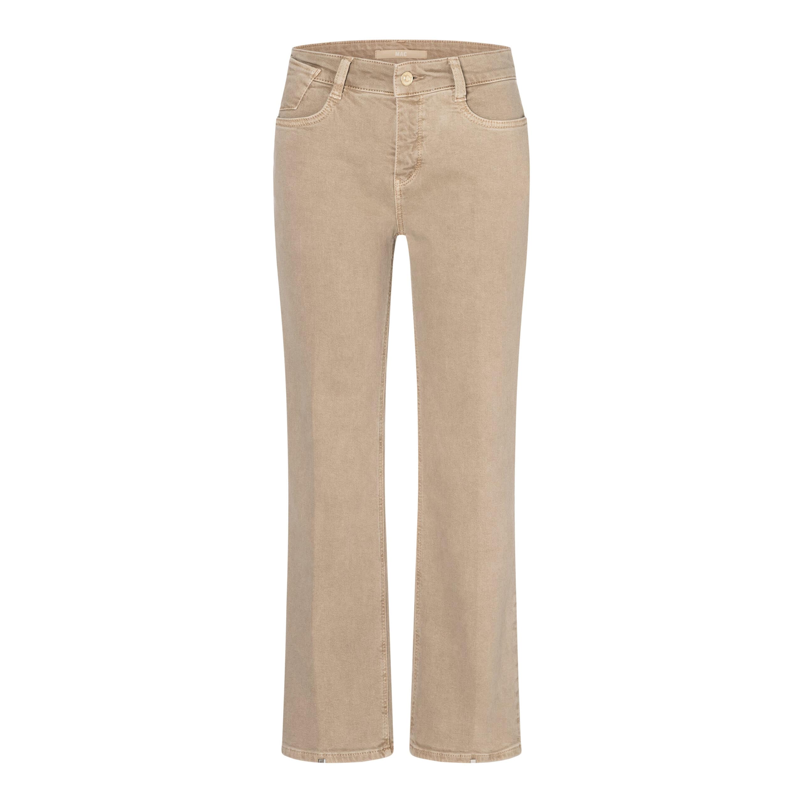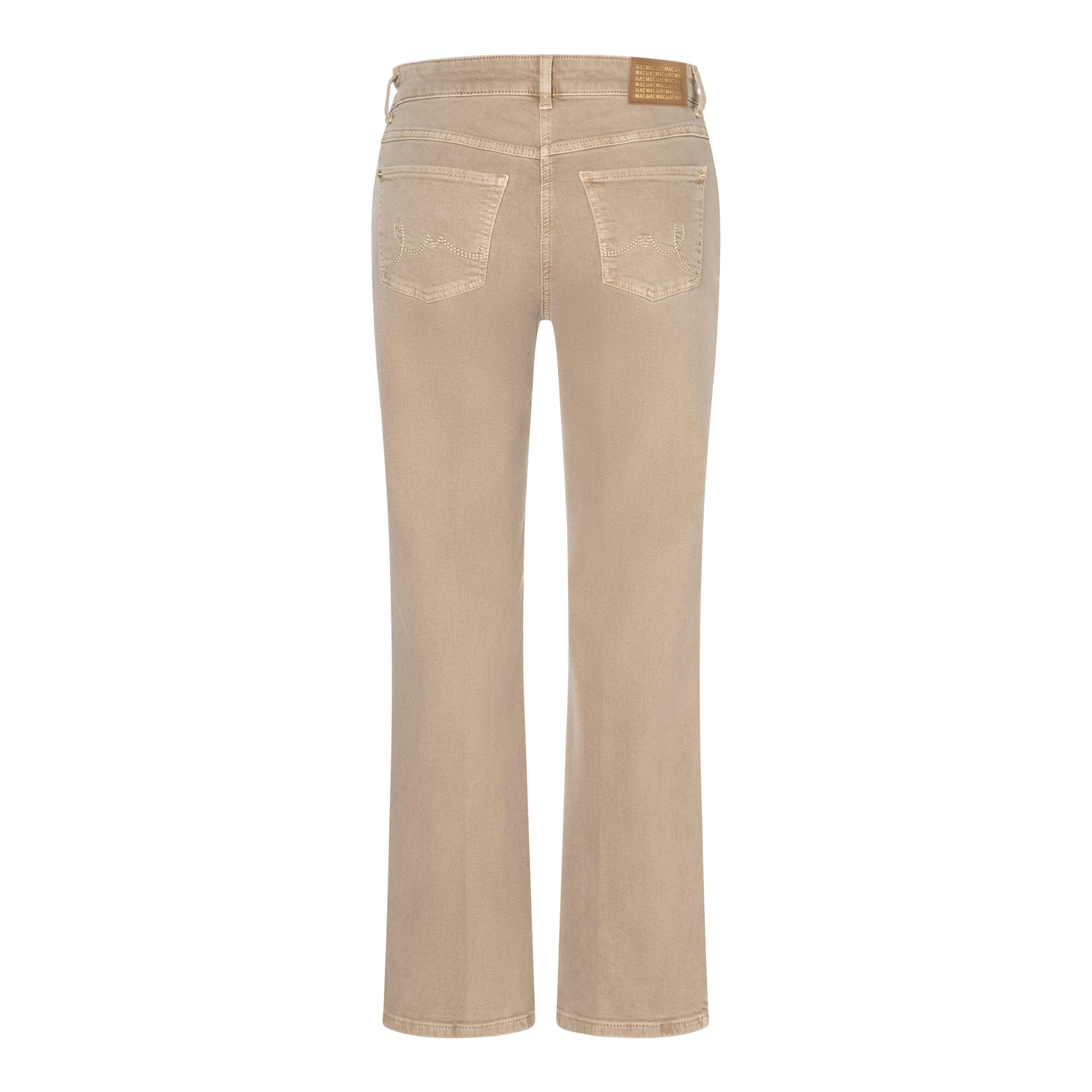 Beige jeans van MAC, model Laura, flared cut, boot cut in string. Deze broek is gemaakt van een denim stretch stof en heeft rechte broekspijpen die licht uitlopen. De jeans sluit met een knoop- en ritssluiting, heeft twee steekzakken aan de voorzijde en twee achterzakken.