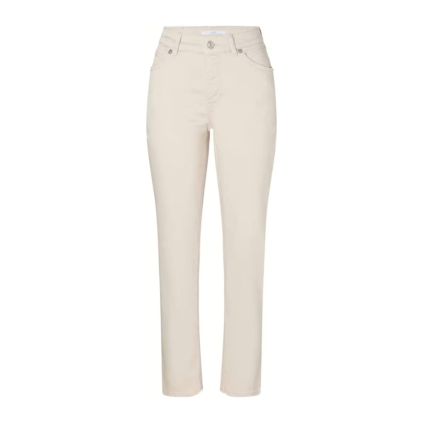 Beige jeans van MAC, model Melanie, feminine fit, straight leg in ivory. Deze rechte broek is gemaakt van beige stretch denim, heeft twee steekzakken en twee achterzakken. De jeans sluit met een knoop- en ritssluiting en heeft een hoge taille.