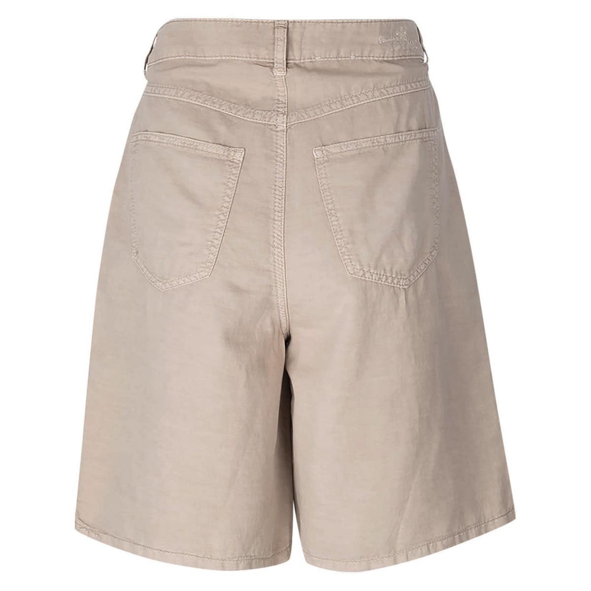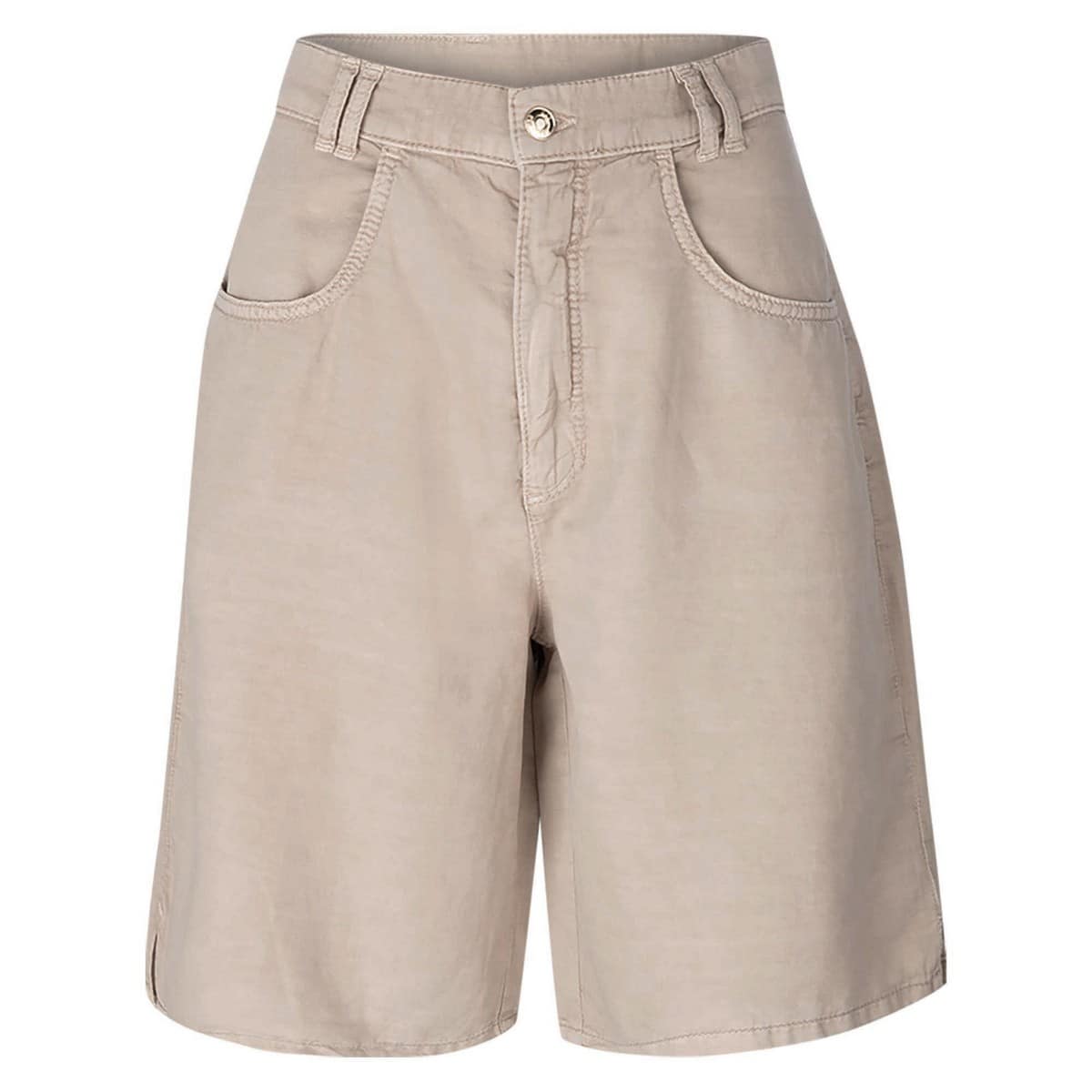 Beige korte broek van MAC, model Shorty sun. Deze shorts is gemaakt van katoen met linnen en lyocell en heeft korte pijpen met een hogere taille. De korte broek sluit met een knoop- en ritssluiting, heeft twee steekzakken en twee achterzakken.
