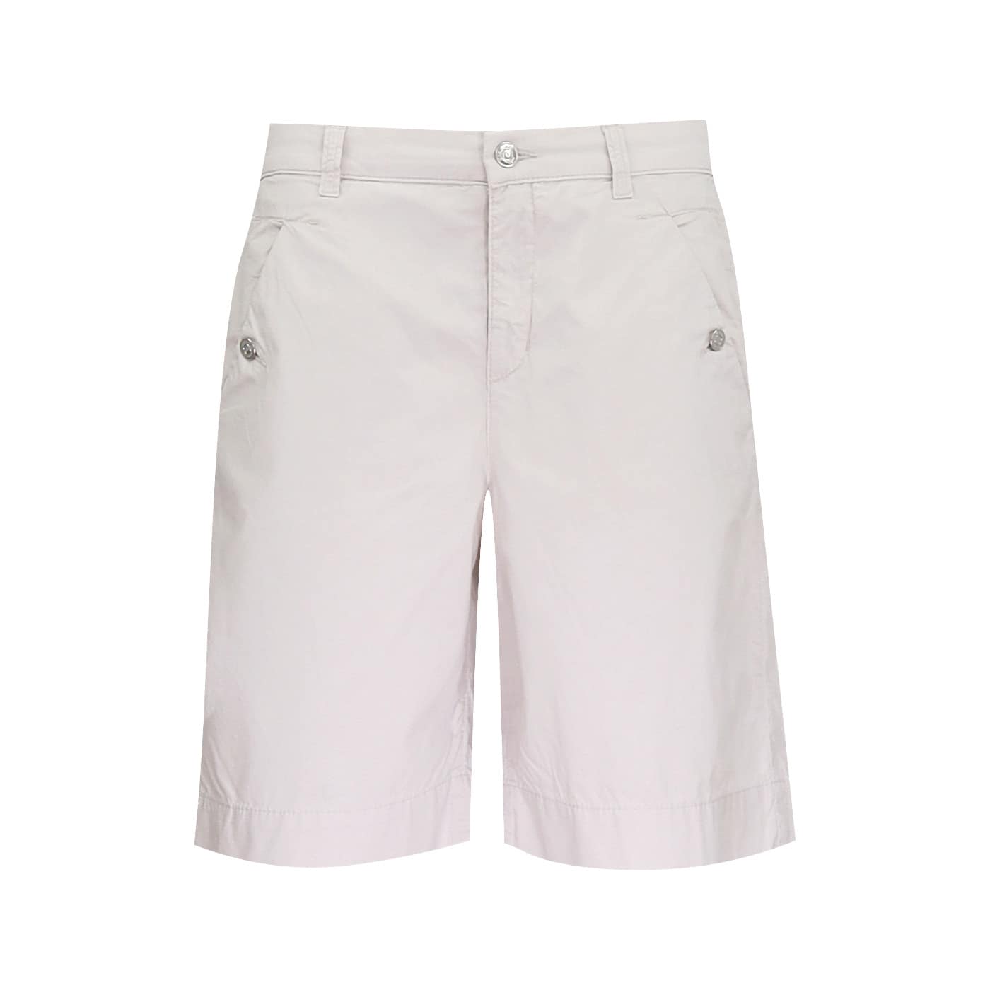 Beige korte broek van MAC, model Svea. Deze short is gemaakt van stretch katoen, heeft een normale taille en korte wijde pijpen. De bermuda sluit met een knoop- en ritssluiting, heeft een elastische tailleband aan de achterzijde, twee steekzakken en twee achterzakken.