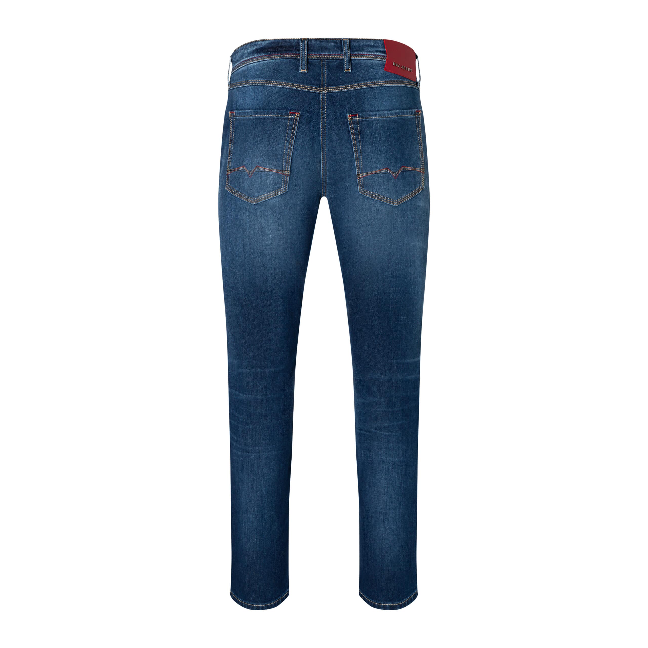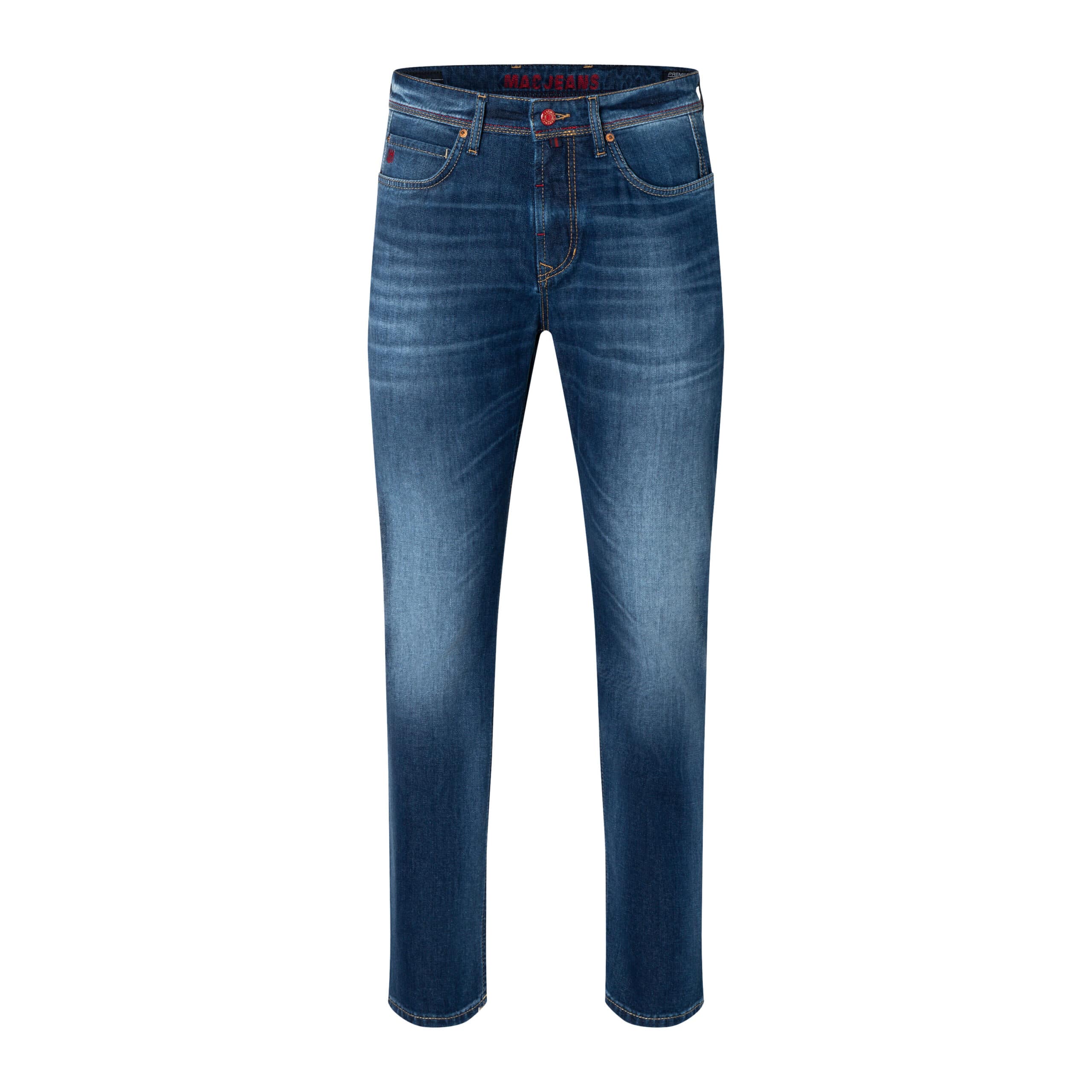 Blauwe jeans van MAC, model Arne, modern fit in gothic blue light used. Deze lange broek is gemaakt van stretch denim, heeft slim legs en rode details. De jeans sluit met een knoop- en ritssluiting, heeft twee steekzakken en twee achterzakken.