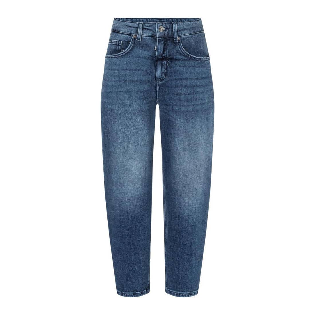 Blauwe jeans van MAC, model Ava Banana carrot banana leg. Deze broek is gemaakt van stretch denim en heeft een barrel fit. De jeans heeft een hoge taille, wijde cropped broekspijpen, sluit met een knoop- en ritssluiting, heeft twee steekzakken en twee achterzakken.