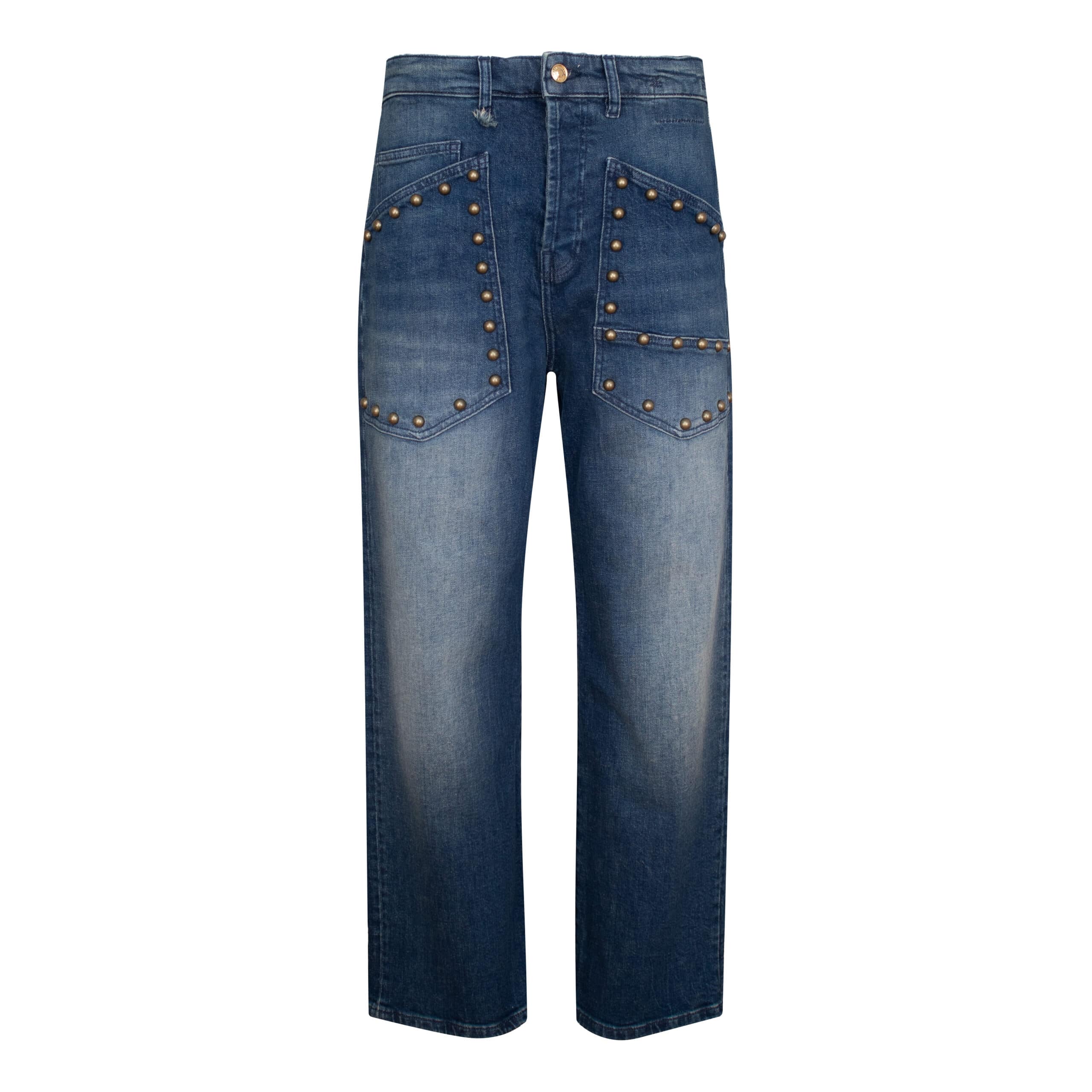 Blauwe jeans van MAC, model Baggy straight glam, relaxed fit, straight leg. Deze los vallende broek is gemaakt van stretch denim en heeft een baggy pasvorm. De broek sluit met een knoopsluiting, heeft een hoge taille, twee steekzakken aan de voorzijde die bezet zijn met studs en twee achterzakken.