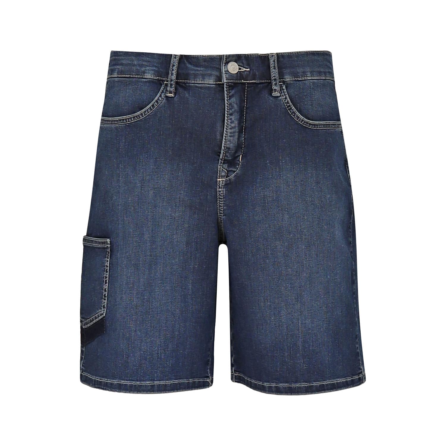 Blauwe bermuda van MAC, model Bermuda cargo patch, wide leg. Deze korte broek is gemaakt van een stretch denim en heeft korte wijde broekspijpen. De shorts sluit met een knoop- en ritssluiting, heeft twee steekzakken, twee achterzakken en een cargo zak op het bovenbeen. De cargo zak en achterzakken hebben een iets donkerdere strook onder de zak, zodat het lijkt dat ze verzet zijn.