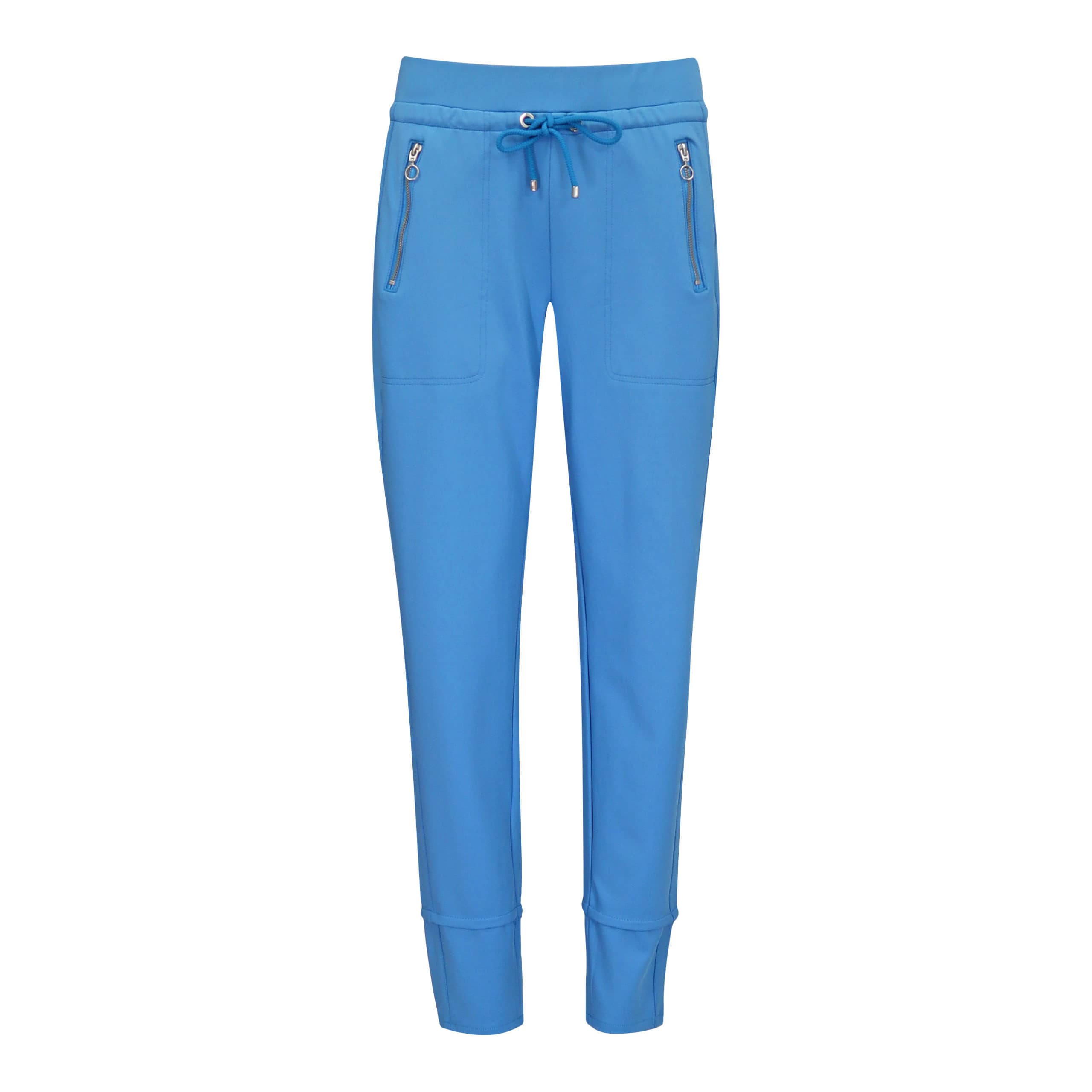 Blauwe relaxte pantalon van MAC, model Easy active. Deze broek heeft twee zakken achter een ritssluiting. De broek is gemaakt van een soepel vallende dunne stretch stof en heeft een elastische taille met trekkoord.