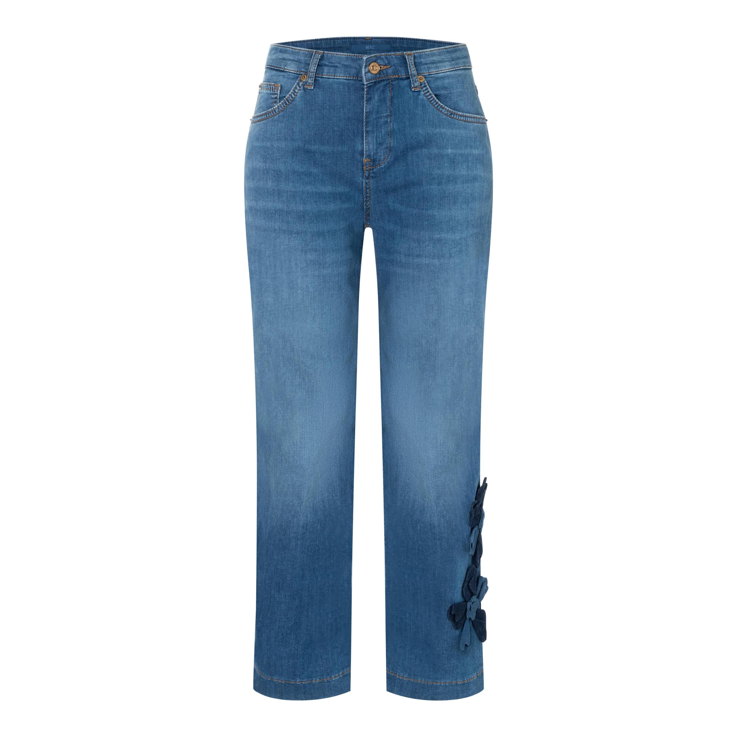 Blauwe jeans van MAC, model Culotte blossom in natty brilliant blue. Deze culotte broek heeft een normale taille en een 7/8 lengte met wijde pijpen met aan één onderzijde denim bloemen. De jeans sluit met een knoop- en ritssluiting, heeft twee steekzakken en twee achterzakken.