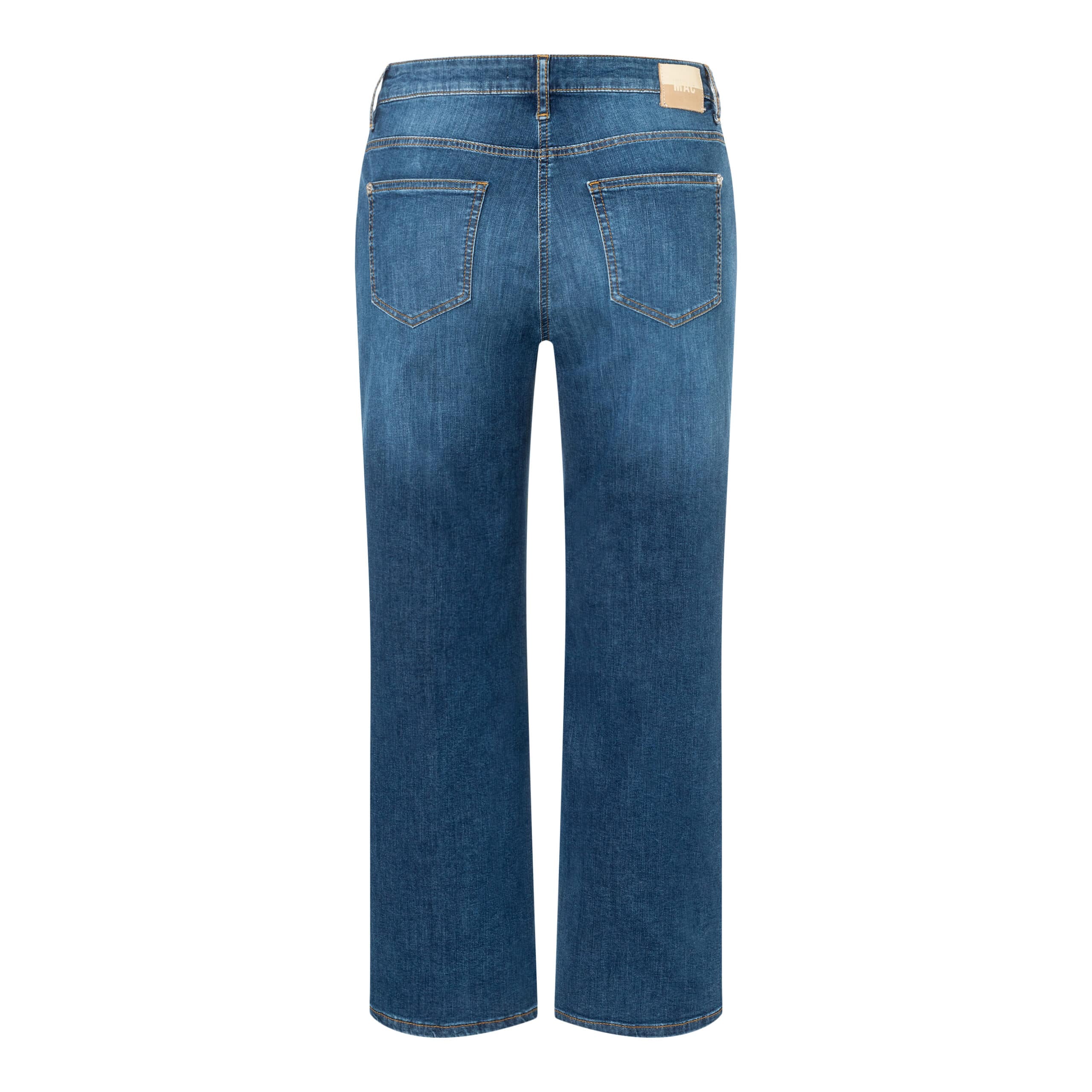 Blauwe jeans van MAC, model Culotte in basic blue stone. Deze culotte broek heeft een normale taille en een 7/8 lengte met wijde broekspijpen. De jeans sluit met een knoop- en ritssluiting, heeft twee steekzakken en twee achterzakken.