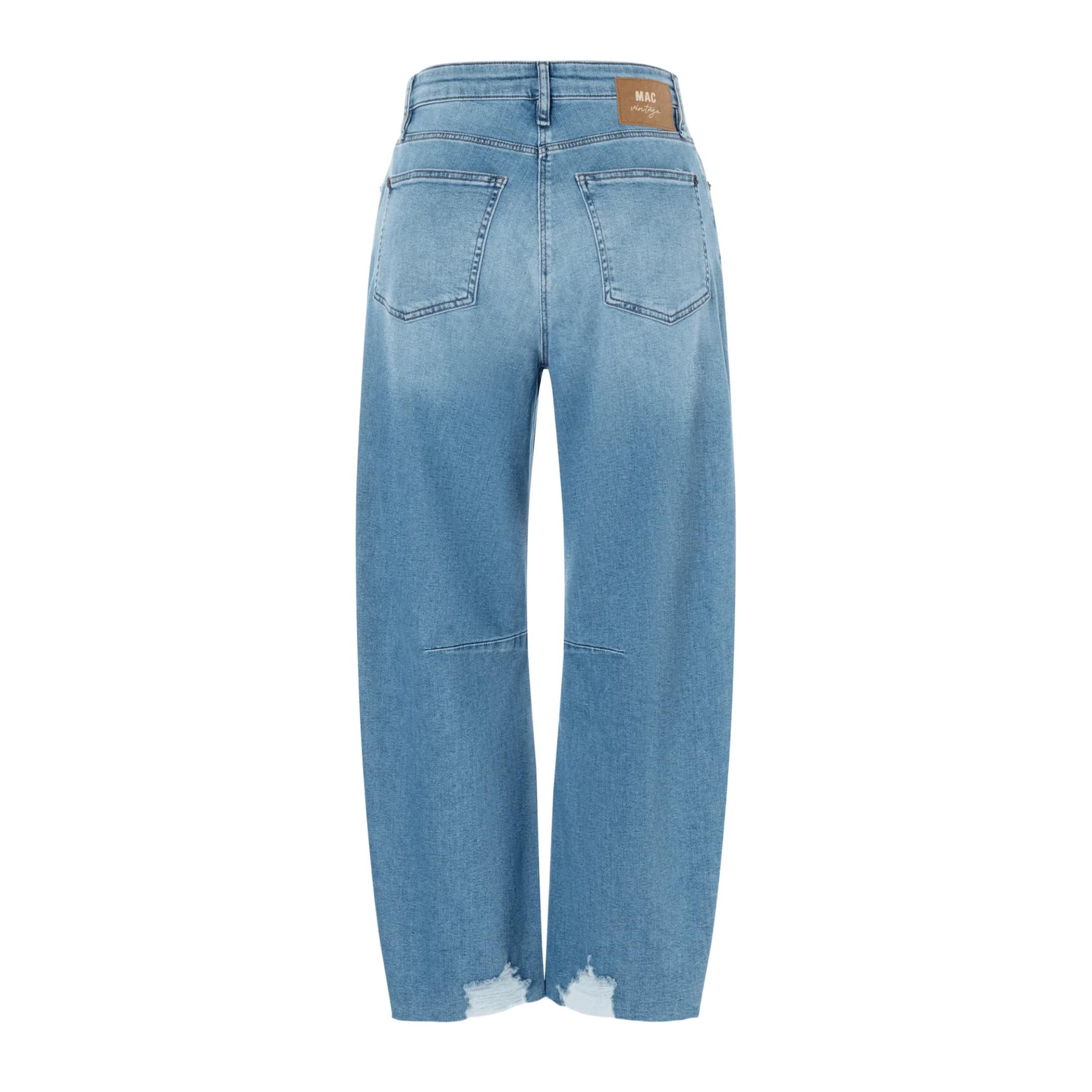 Blauwe jeans van MAC, model Dakota fringe, straight fit, barrel leg, highwaist in destroyed lake blue. Deze los vallende broek is gemaakt van blauwe stretch denim met een gerafelde onderzijde en heeft een barrel pasvorm. De broek sluit met een knoopsluiting en heeft twee steekzakken aan de voorzijde en twee achterzakken.