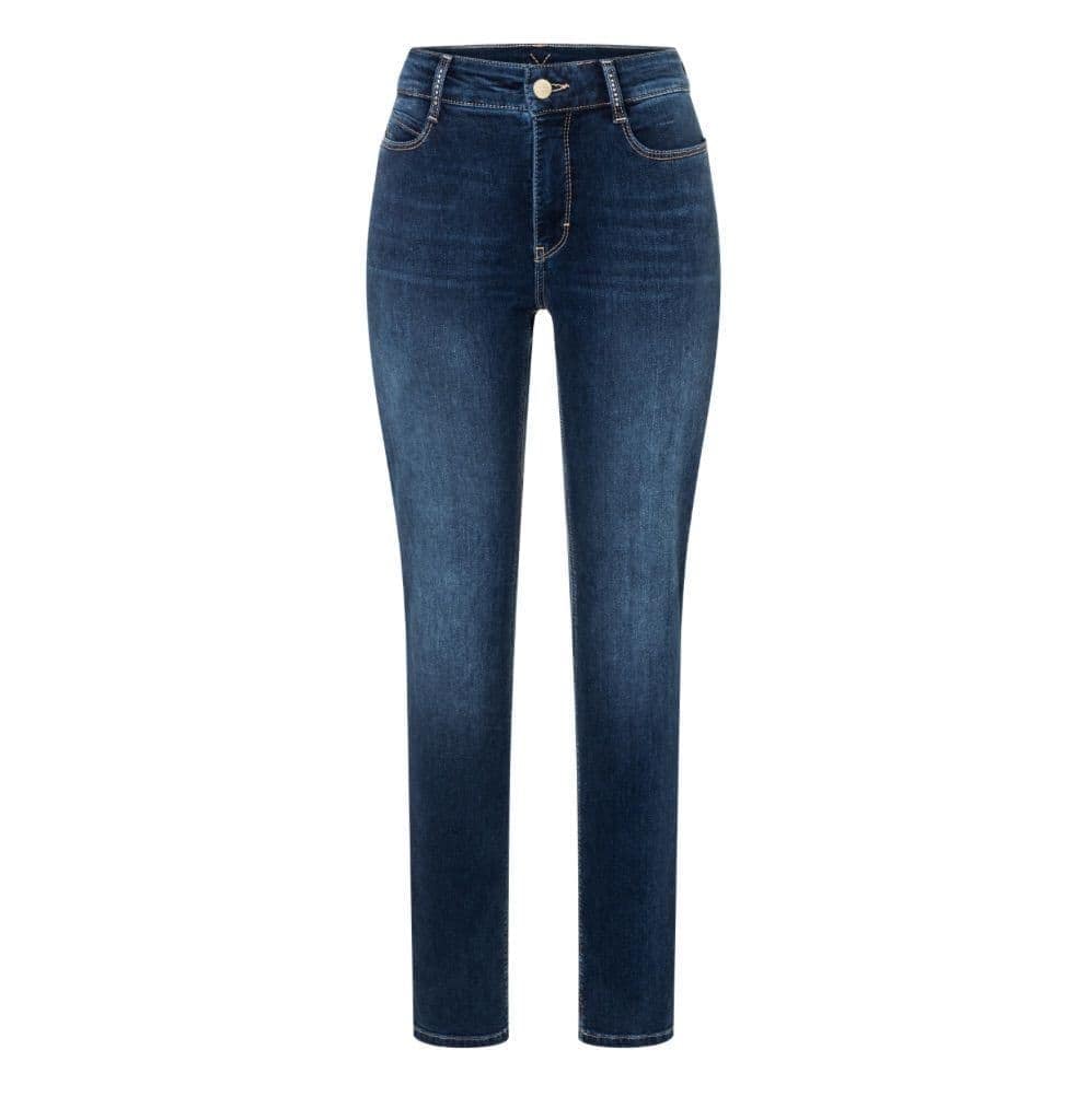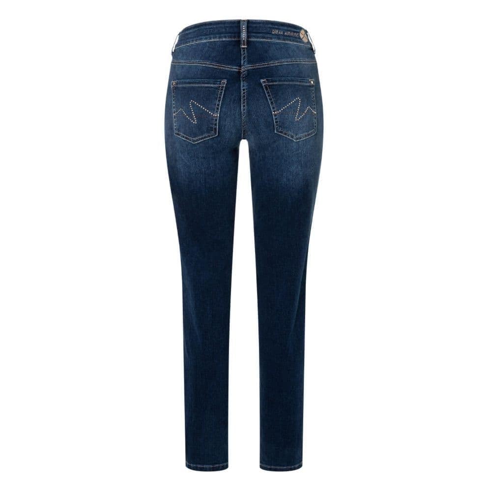 Blauwe jeans van MAC, model Dream authentic glam, straight leg. Deze broek is gemaakt van stretch denim en heeft een normale taille met rechte broekspijpen. De jeans sluit met een knoop- en ritssluiting en heeft twee steekzakken en twee achterzakken die versierd zijn met zilveren studs.