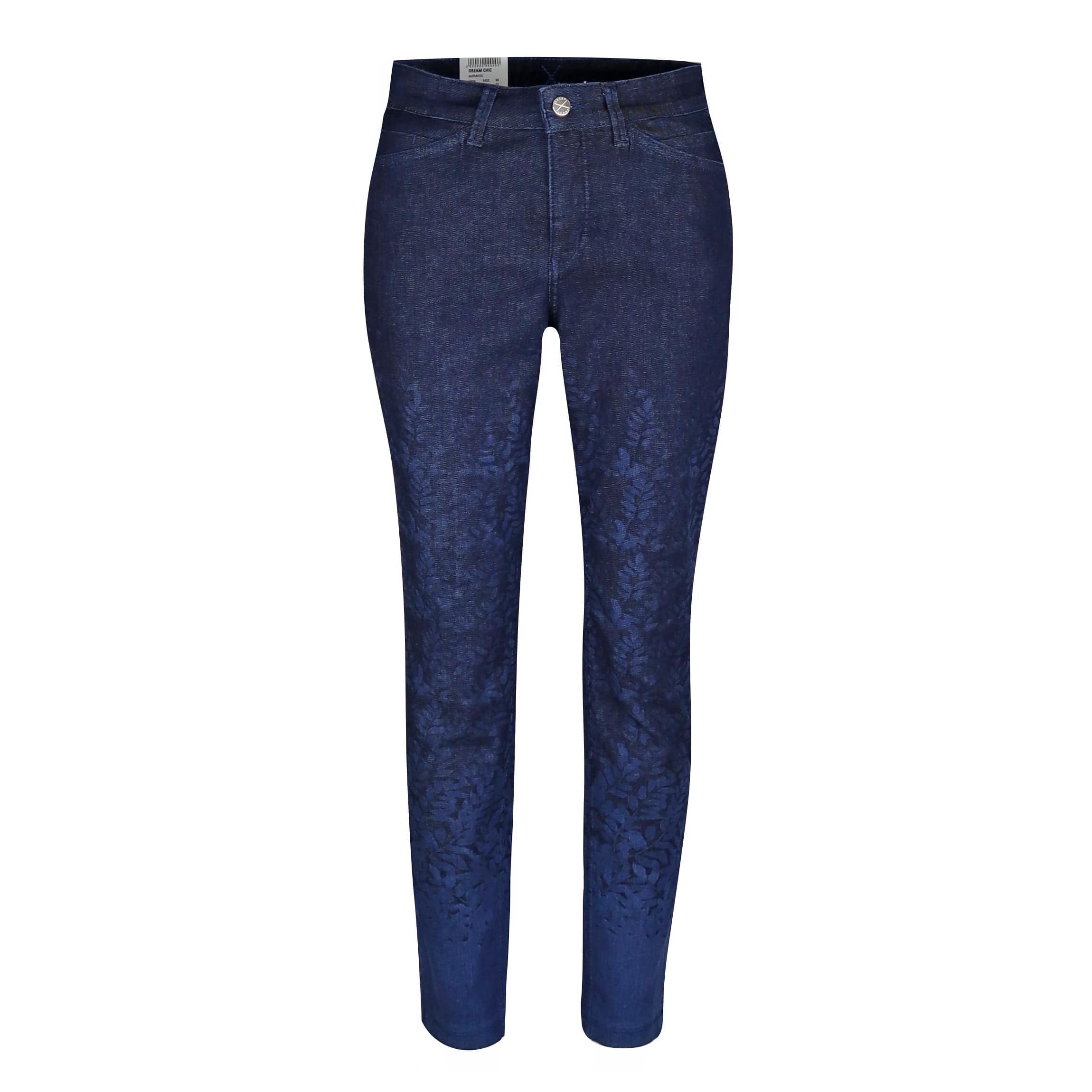 Blauwe jeans van MAC Jeans, model Dream Chic Authentic. Deze broek is gemaakt van donkerblauwe stretch denim met een overloop met blad motief naar lichter blauw. De jeans heeft een normale taille met slim fit pasvorm, sluit met een knoop- en ritssluiting, heeft twee steekzakken, twee achterzakken en ritsjes onderaan de broekspijpen.