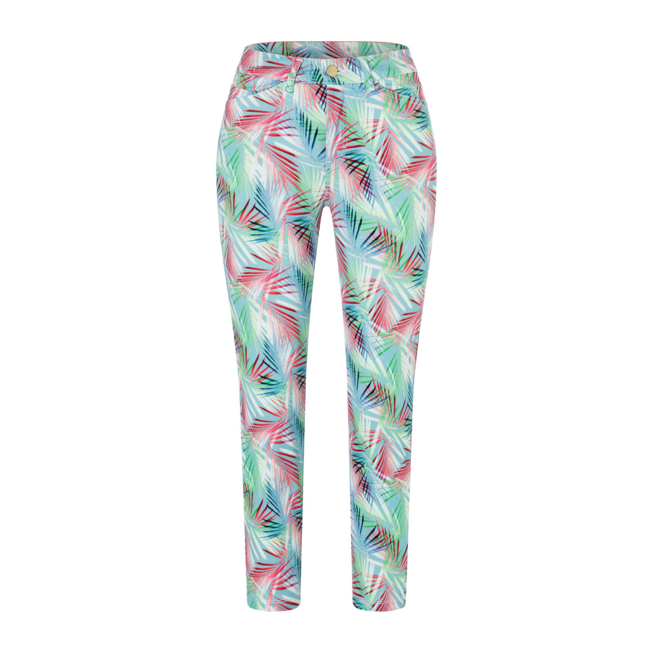 Lichtblauwe jeans met print van MAC Jeans, model Dream Chic, slim leg in baby blue printed. Deze broek is gemaakt van stretch denim en heeft een normale taille met slim fit pasvorm. De jeans sluit met een knoop- en ritssluiting, heeft twee steekzakken, twee achterzakken en ritsjes onderaan de broekspijpen.