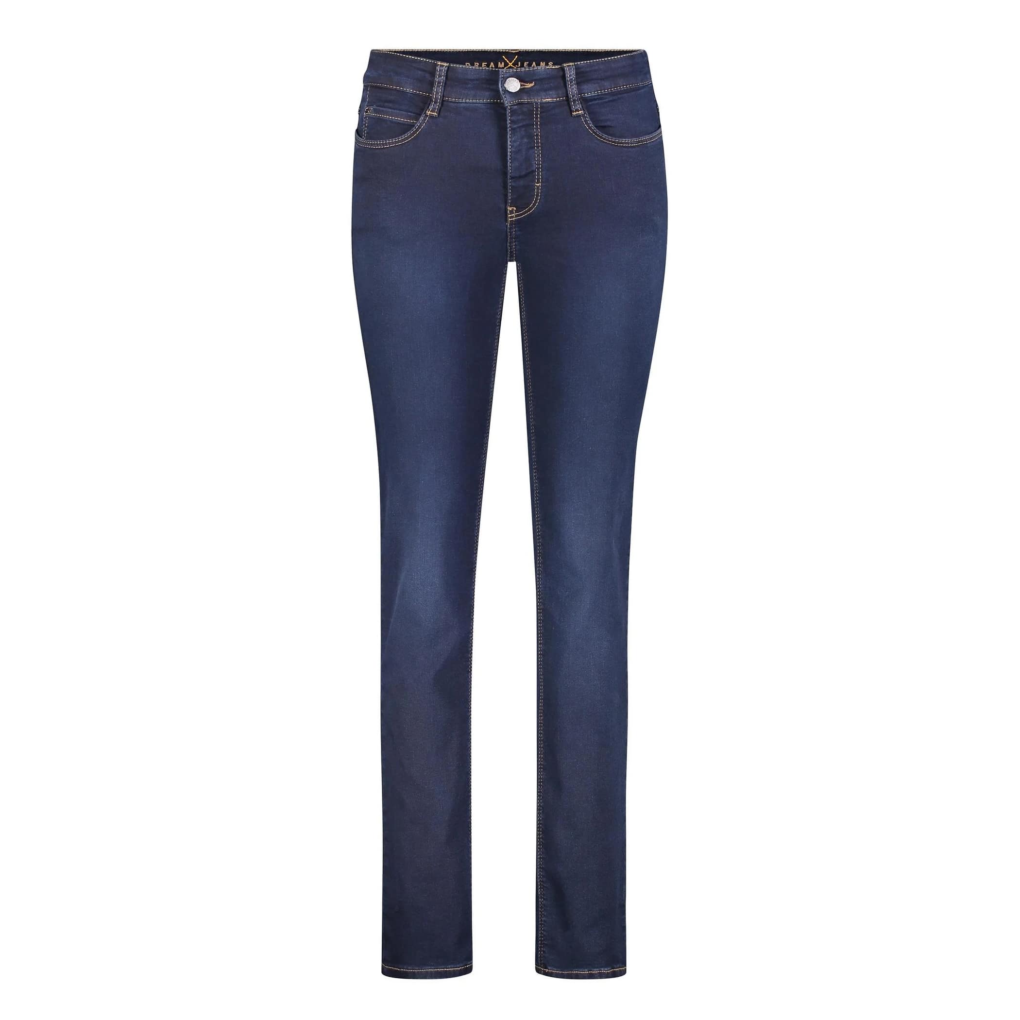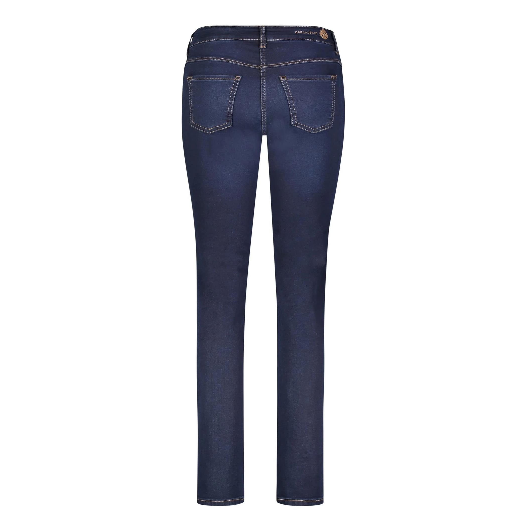 Blauwe jeans van MAC, model Dream Chic in dark wash. Deze broek is gemaakt van donkerblauwe stretch denim en heeft een slim fit pasvorm. De jeans sluit met een knoop- en ritssluiting, heeft twee steekzakken, twee achterzakken en ritsjes onderaan de broekspijpen.