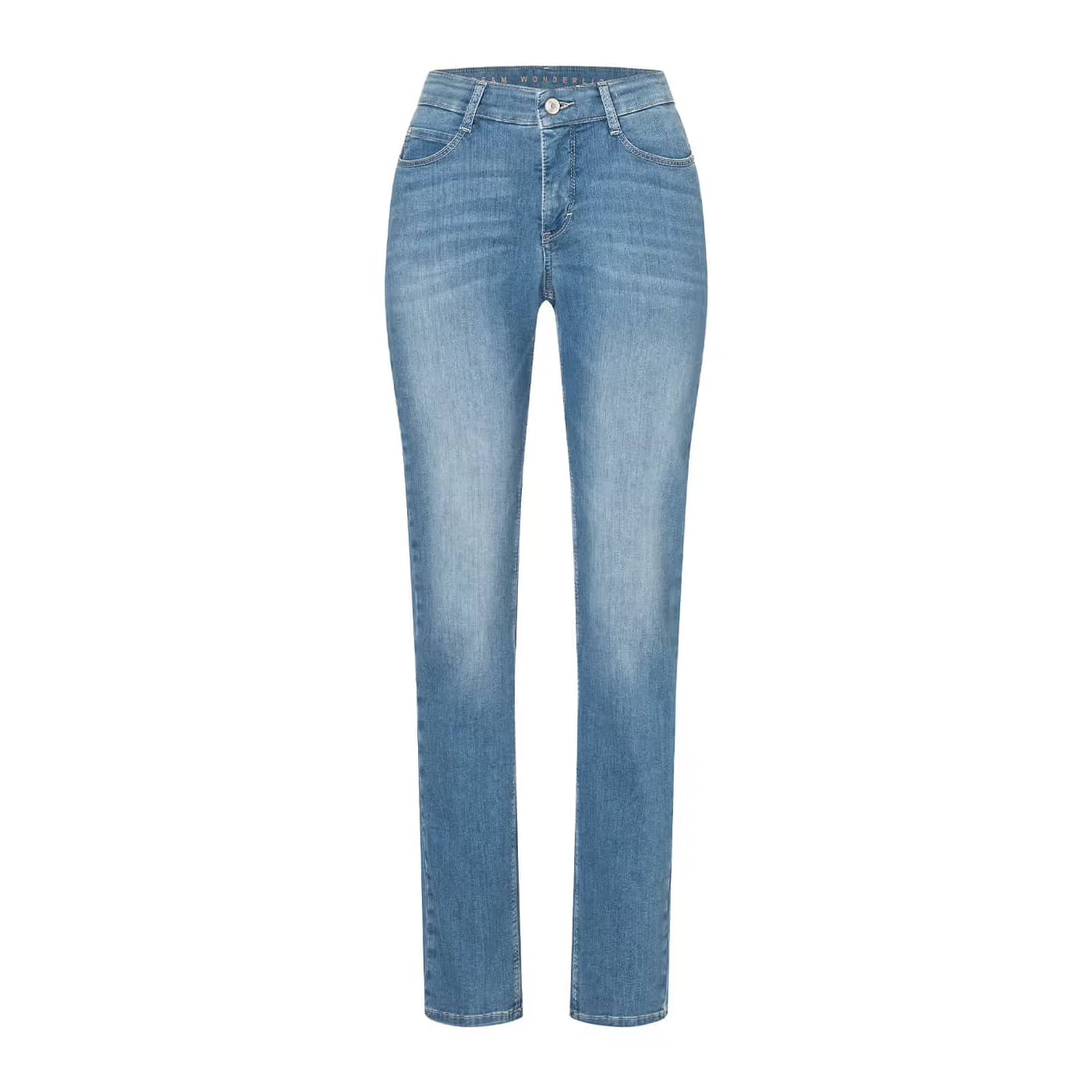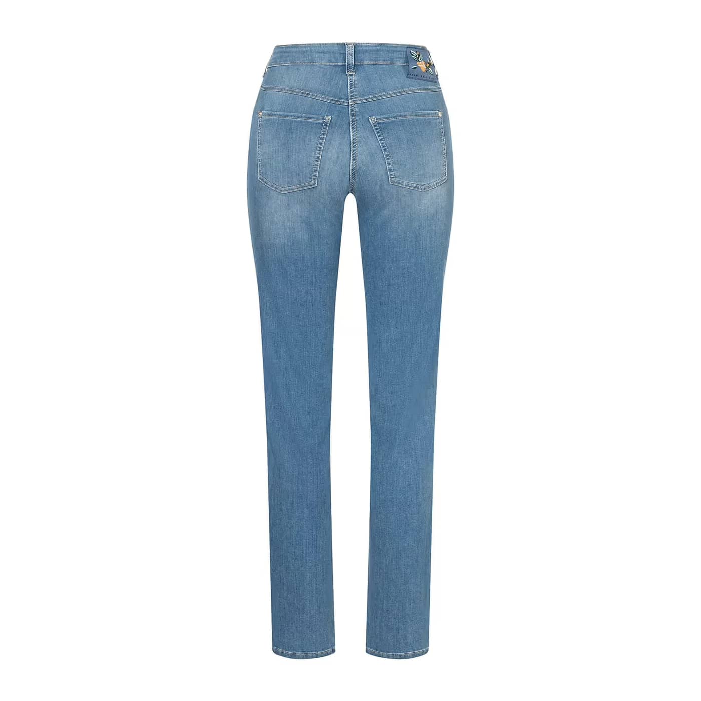 Blauwe jeans van MAC, model Dream, straight leg in simple blue washed. Deze broek is gemaakt van stretch denim, heeft twee steekzakken aan de voorzijde, twee achterzakken en sluit met een knoop- en ritssluiting. De jeans heeft een slim fit pasvorm en mid-rise waist.
