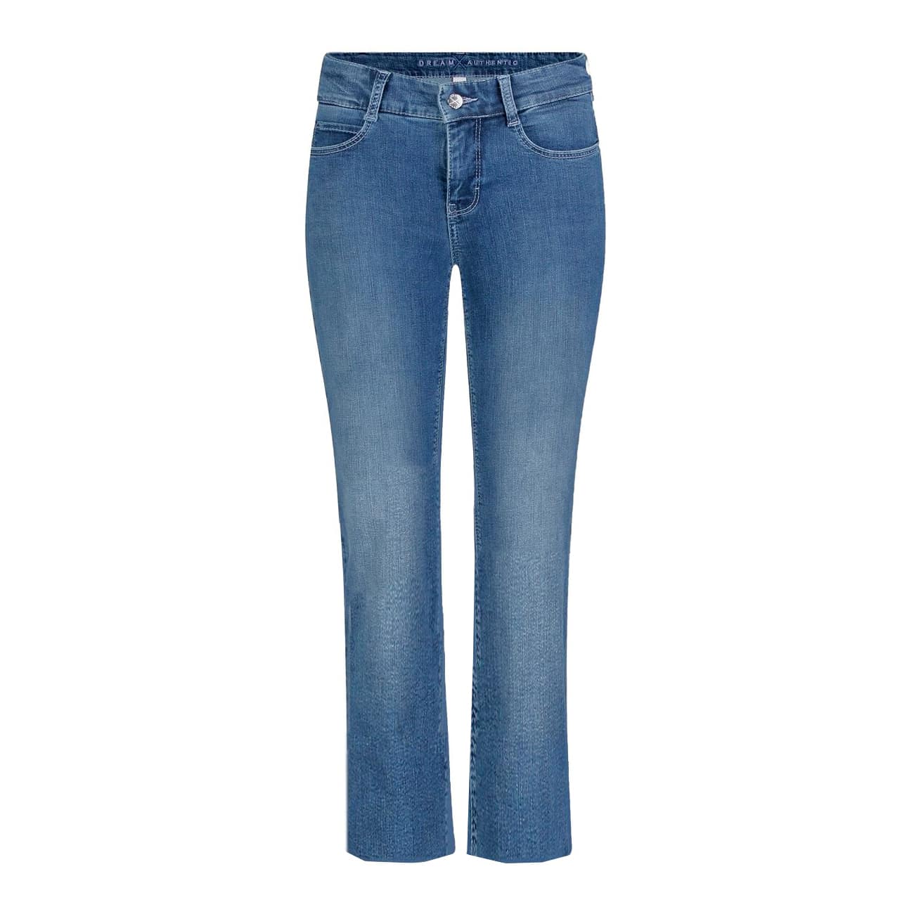 Blauwe jeans van MAC, model Dream Kick authentic. Deze 7/8 denim broek heeft een normale taille, twee steekzakken aan de voorzijde, twee achterzakken en sluit met een knoop- en ritssluiting. De jeans is gemaakt van een denim stretch stof en heeft broekspijpen die op het einde licht uitlopen.