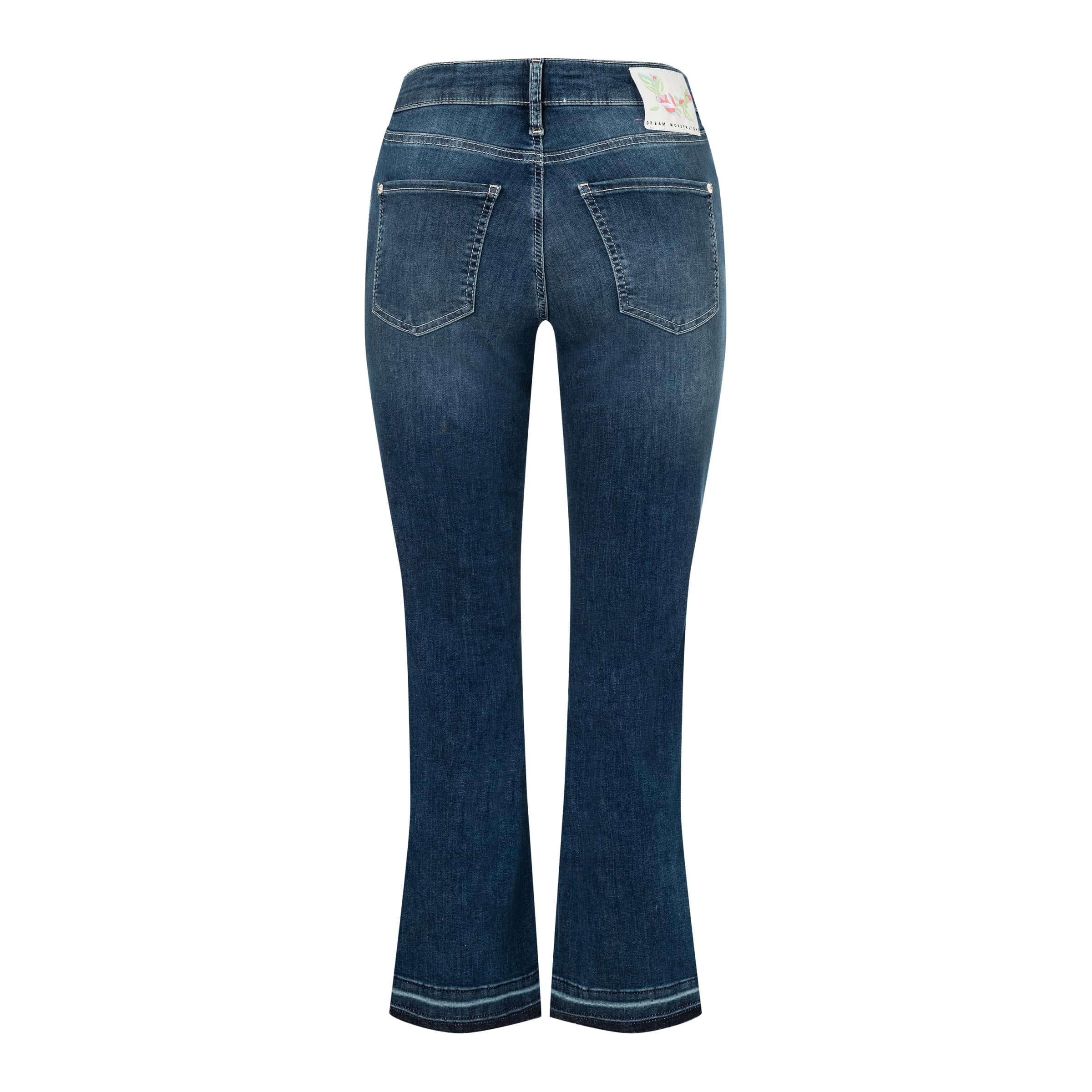 Blauwe jeans van MAC, model Dream Kick open hem in subway blue. Deze 7/8 denim broek heeft een hoge taille, twee steekzakken aan de voorzijde, twee achterzakken en sluit met een knoop- en ritssluiting. De jeans is gemaakt van een denim stretch stof (wonderlight) en heeft flared broekspijpen met een onafgewerkte zoom.